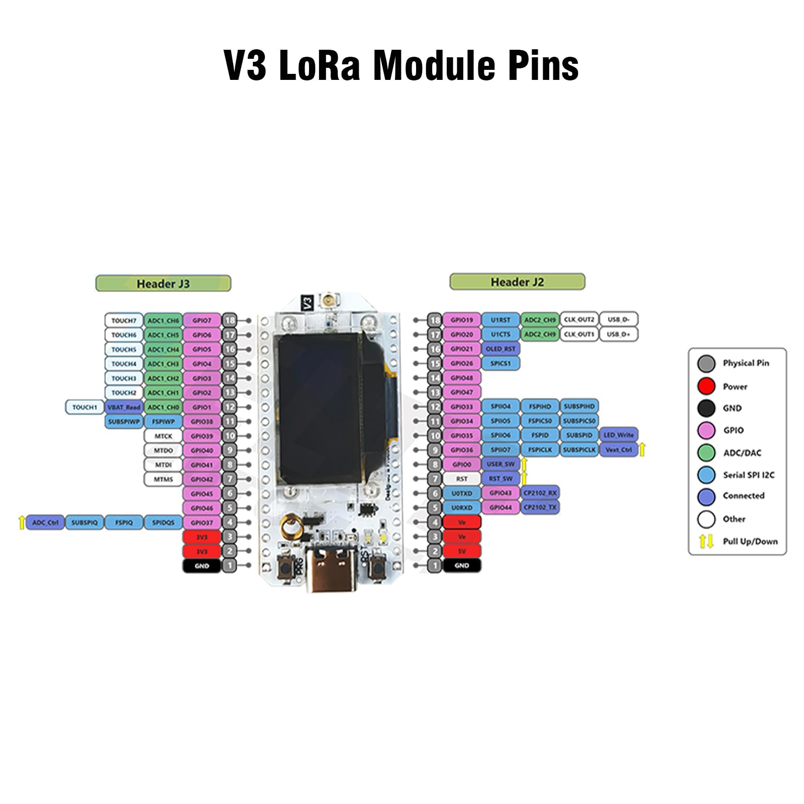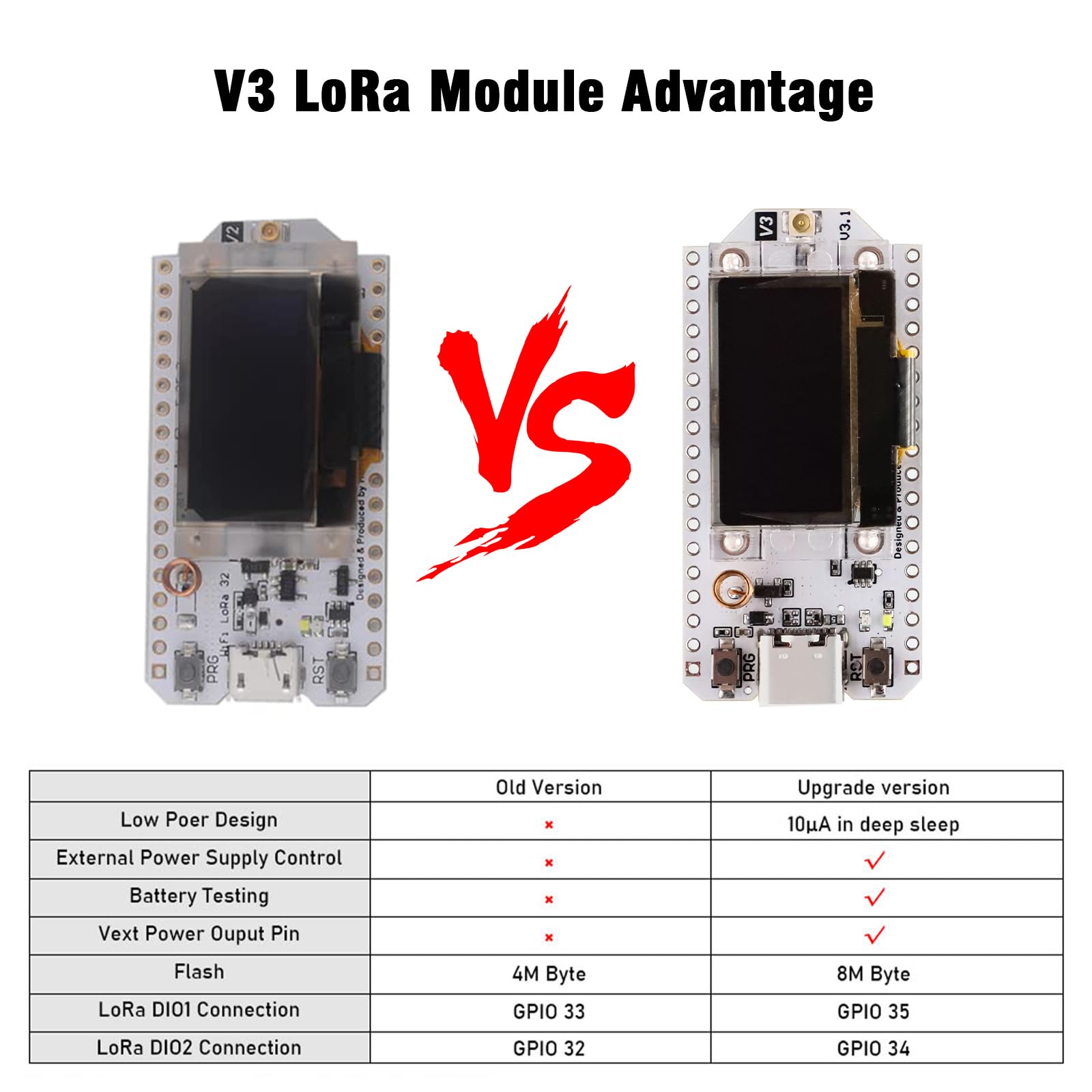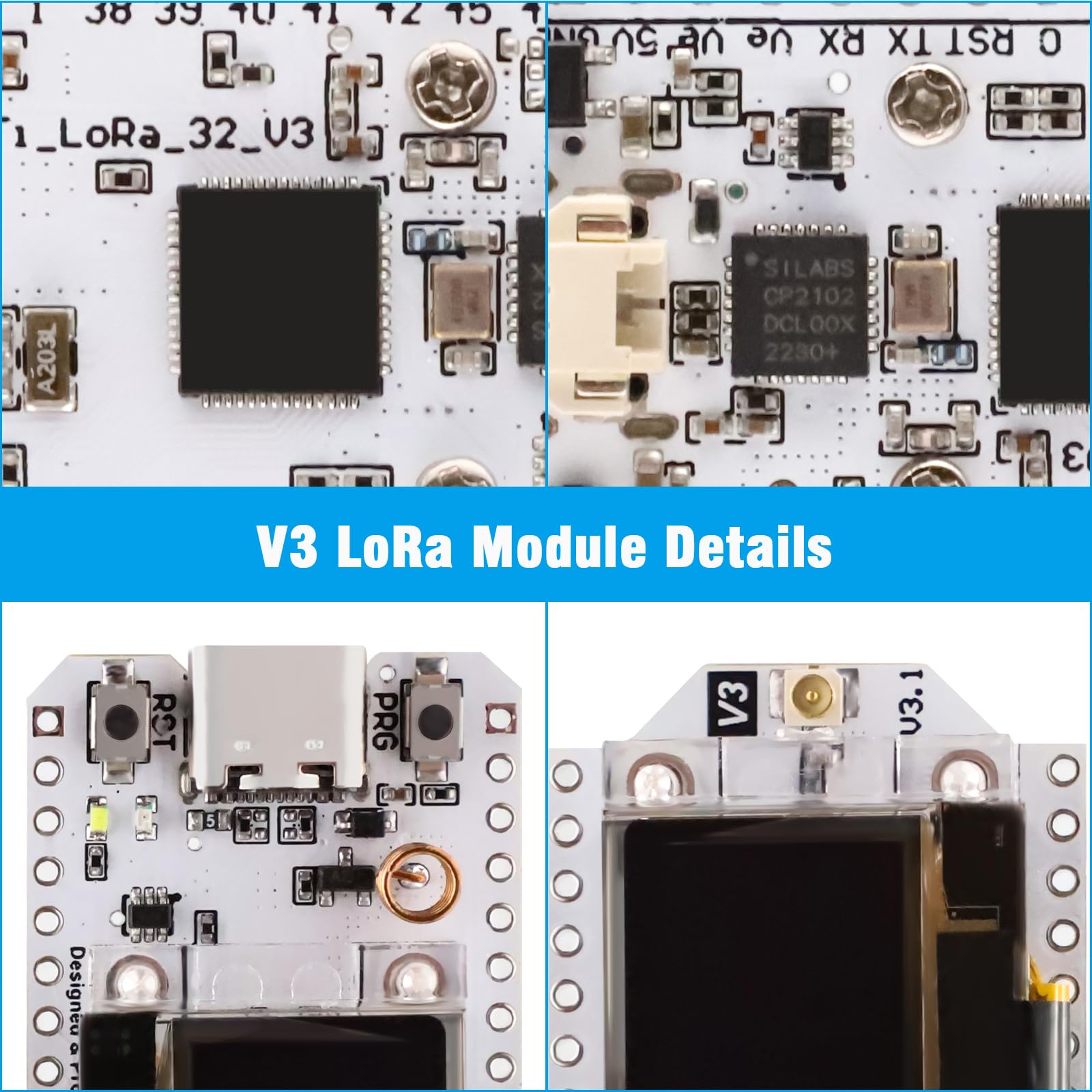 The ESP32 V3 LORA development board with OLED display is an integrated hub with an Arduino development board and LoRa communication functions