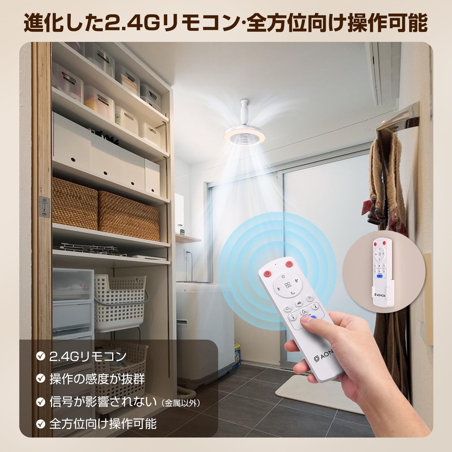 【2.4Gリモコン操作・角度調整・お手入れ簡単】進化した2.4Gリモコン(技適番号:217-241289)は従来品の赤外線モデルより、操作感度と範囲を大幅に改善しました。更に、LED電源とファン部のON・OFFはもちろん、調色、調光、風量調節までリモコンで操作可能です。LED照明だけでなく、オールシーズンも大活躍します。また、手動でファン部の角度に調節でき、垂直方向に約180度、水平方向には約300度調整可能です。前ガードを取り外し可能なので、日常のお手入れもラクラクになります。