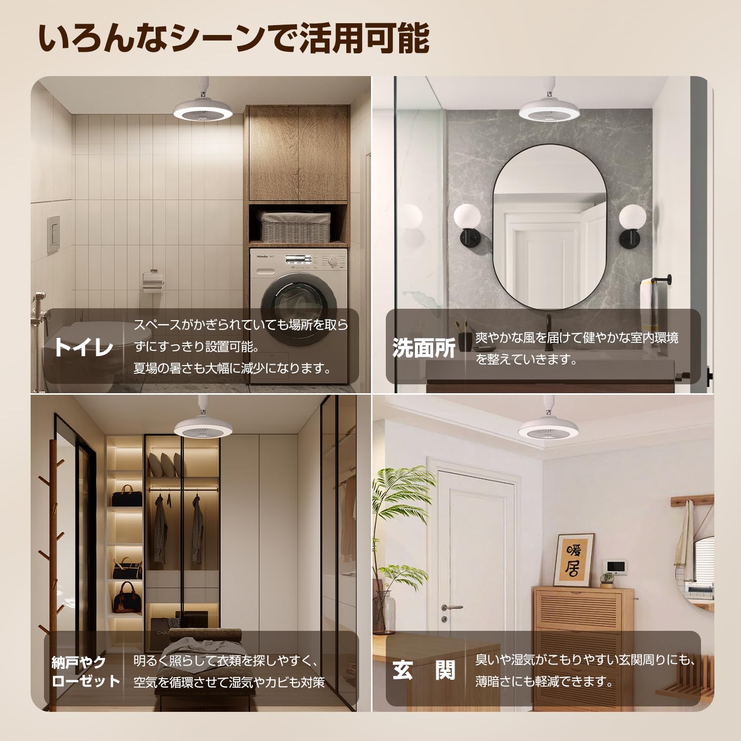 【LED/ファンタイマー・省エネ・いろんなシーンで活用】設定時間(30分後)が経過すると、LED/ファンの電源が自動で切れます。また、高効率LEDチップだけでなく、LEDチップの発光効率を最大限に引きだす電源の設計技術にもこだわっています。最大点灯時でも、消費電力はたったの15W。ファン部最大の消耗電力は4Wでとても省エネです。玄関、トイレ、洗面所など様々のところで活躍られます。