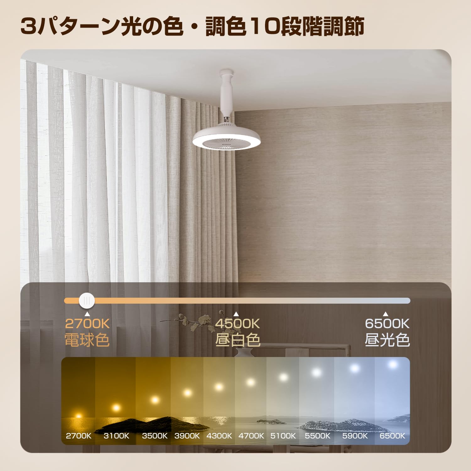 【高演色性・調色/調光10段階・風量調節3段階】高品質なLEDチップを採用し、美しい輝きを放ち華やかな空間を演出します。設置場所によって、昼光色、昼白色、電球色の3種類からを選択できます。リモコン操作でお好みの点灯モードに6500K~2700K10%調色することができて、LED照明の明るさを10%ずつ10段階で調節可能です。使うシーンに合わせて使い分けられます。高品質な羽根によって、肌あたりのよい柔らかい風を実現しましす。3段階風量調節も可能です。