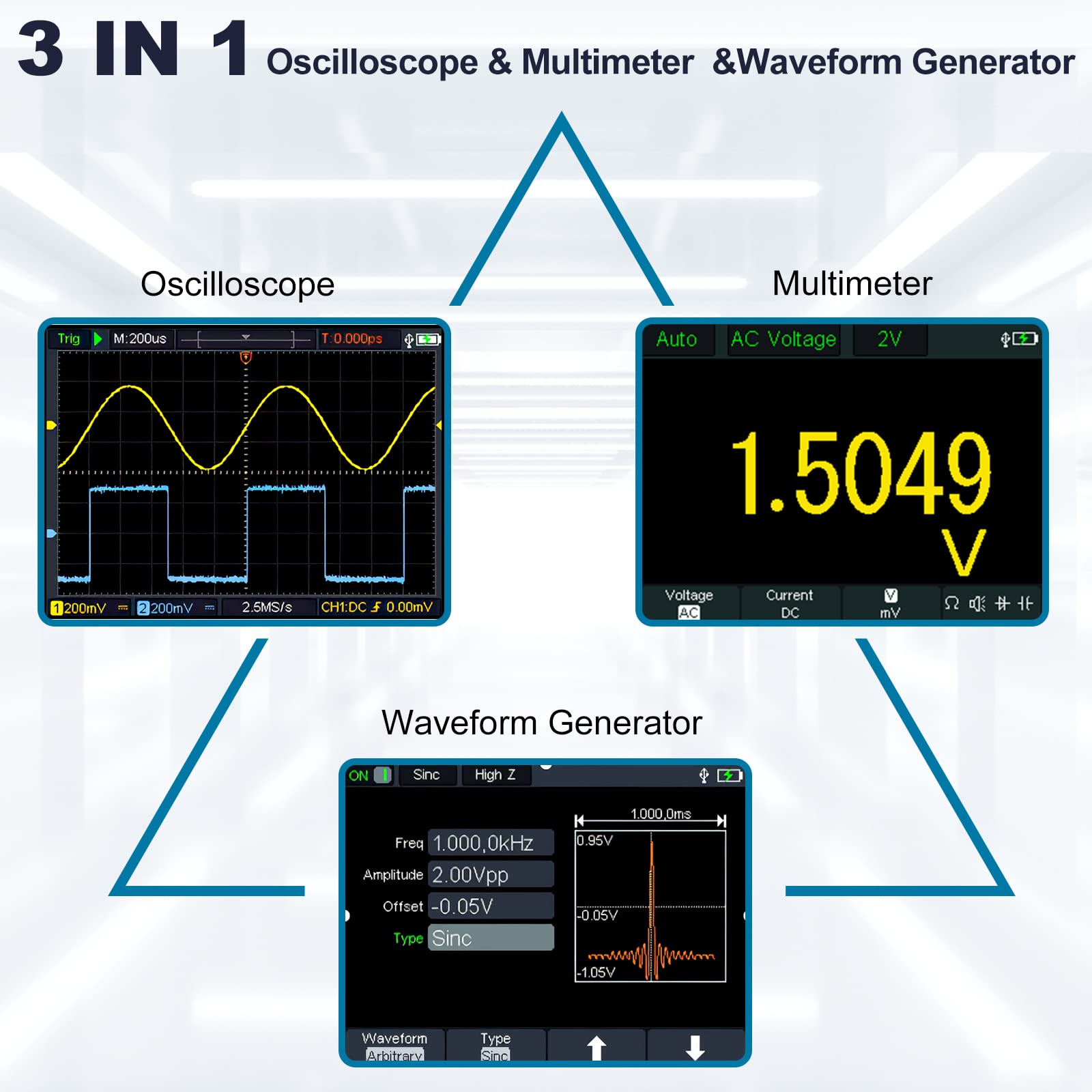 HANMATEK HO52S Digital Oscilloscope 50Mhz Bandwidth, 2 Channel 3 in 1 Oscilloscope/Multimeter/Signal Generator Mini Oscilloscope with 3.5" TFT Backlit Screen, Auto Calibration, Memory Function