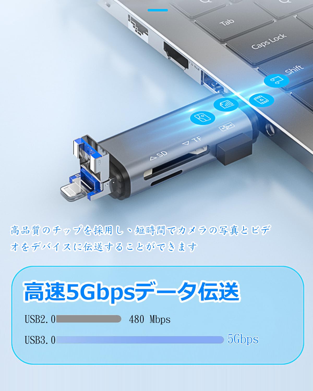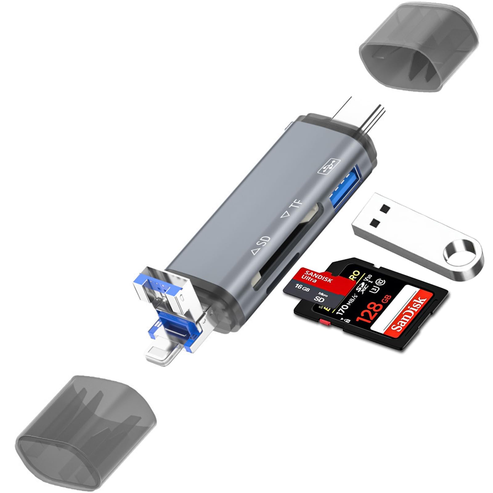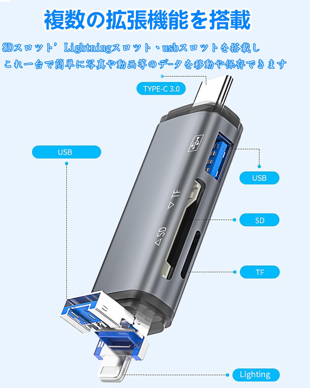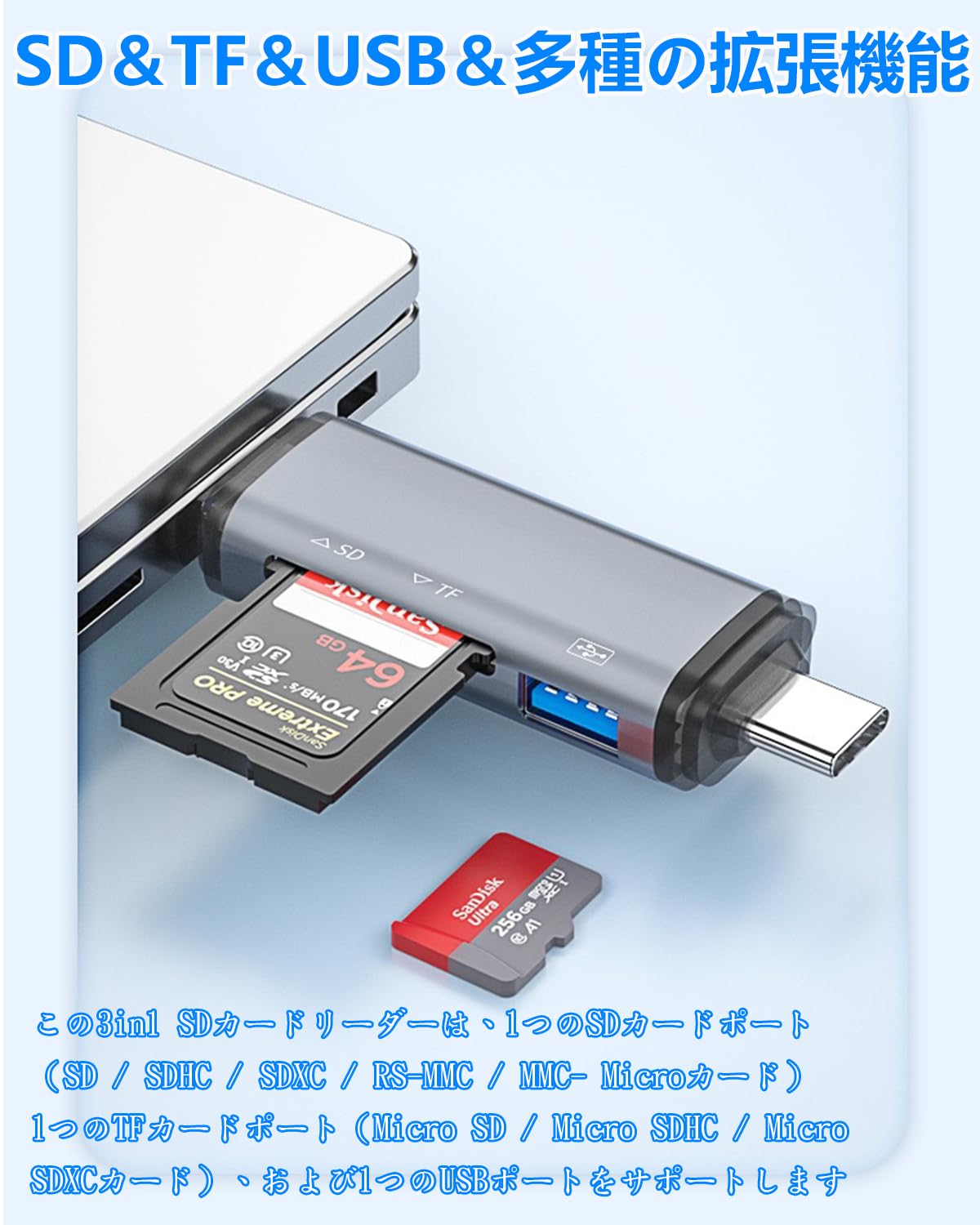【3 in 1 Multifunctional SD Card Reader】This 3 in 1 SD card reader supports 1 SD card port (SD / SDHC / SDXC / RS-MMC / MMC- Micro Card), 1 TF card port (Micro SD / Micro SDHC / Micro SDXC card), and 1 USB port (USB 3.0). Type c+Micro USB+USB 3 kinds of ports is a multi-functional SD/TF/USB card reader that is perfect for data transfer on PC and OTG enabled tablets, Android smartphones. Read/write up to 2TB memory cards simultaneously Compatible with OTG devices. 【5Gbps High Speed Data Transfer】Type-C and USB 3.0 ports can reach data transfer speeds up to 5Gbps. It will be a little faster than the USB 2.0 port on the market depending on the speed of retrieving data by inserting it approx. Adopting high quality chip, you can quickly transmit photos and videos of your camera to your device. Not only can you transfer photos and videos, but also Word, Excel, PDF, etc. The SD card reader terminal case is made of aluminum insulation that will not get hot even after long periods of transmission. 2 slots for simultaneous media use and mutual copy with each slot [Various Extensions] Easy data transfer and backup for Android smartphones or tablets with USB Type C OTG function anytime, anywhere. When you want to replace your smartphone with a new one, this card reader can easily backup your old data using your smartphone's OTG function. Store your games and HD videos without taking up much space on your smartphone or computer and save it in a USB or SD card so you can view it anytime and anywhere. 【Easy to Connect & Portable】 For Windows 8 / Mac OS X 10.2 / Android 4.0 or later devices, no need to install additional drivers, just insert the card reader. Card reader LED will light up when you connect your device successfully using the Type-C/USB/Micro USB interface. This is very suitable. This will help you check whether the card reader is not a problem. Ultra lightweight and compact design makes it easy to carry, perfect for a variety of occasions such as daily life, travel, or work. It can be easily stored in the pocket for business trips.