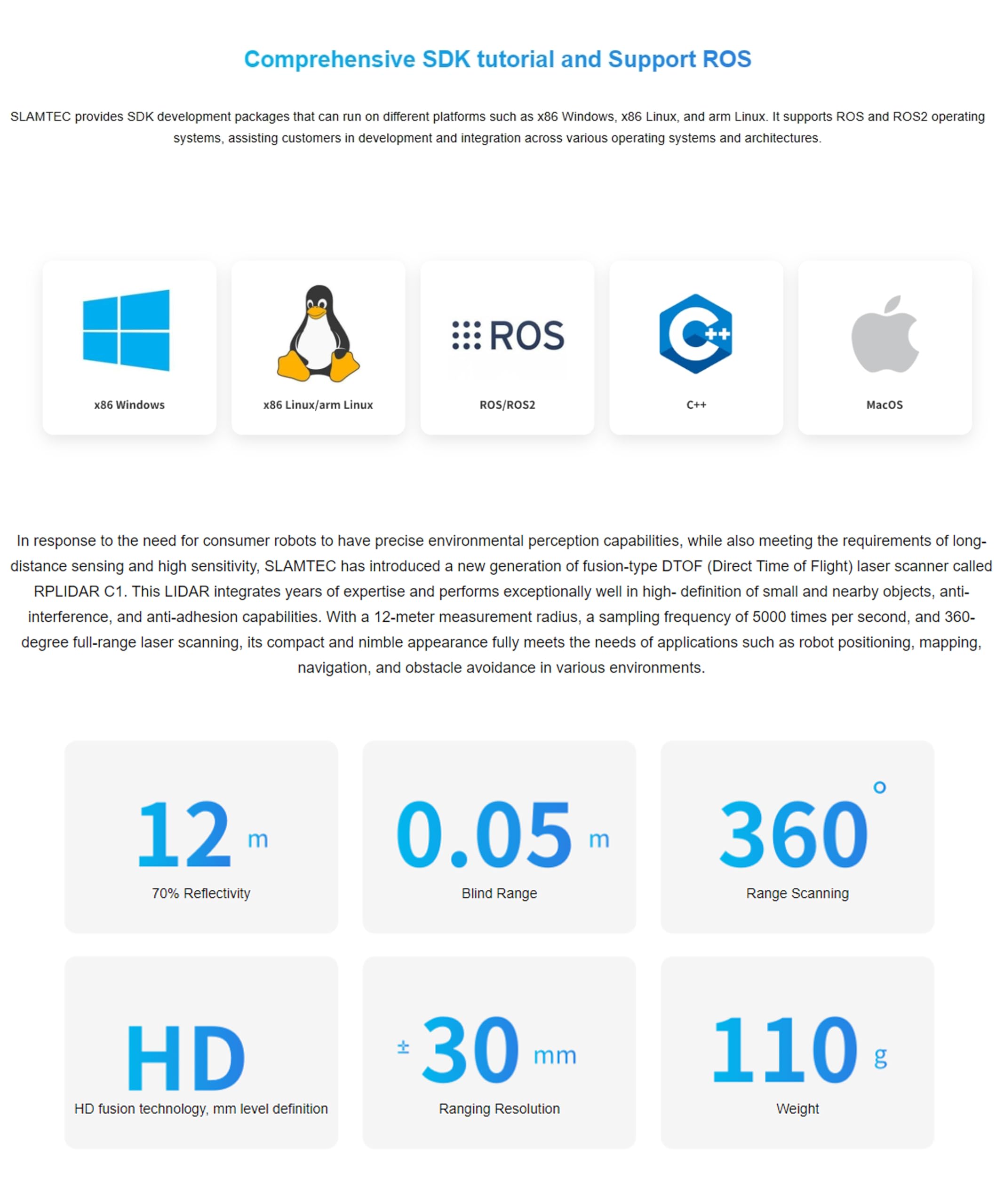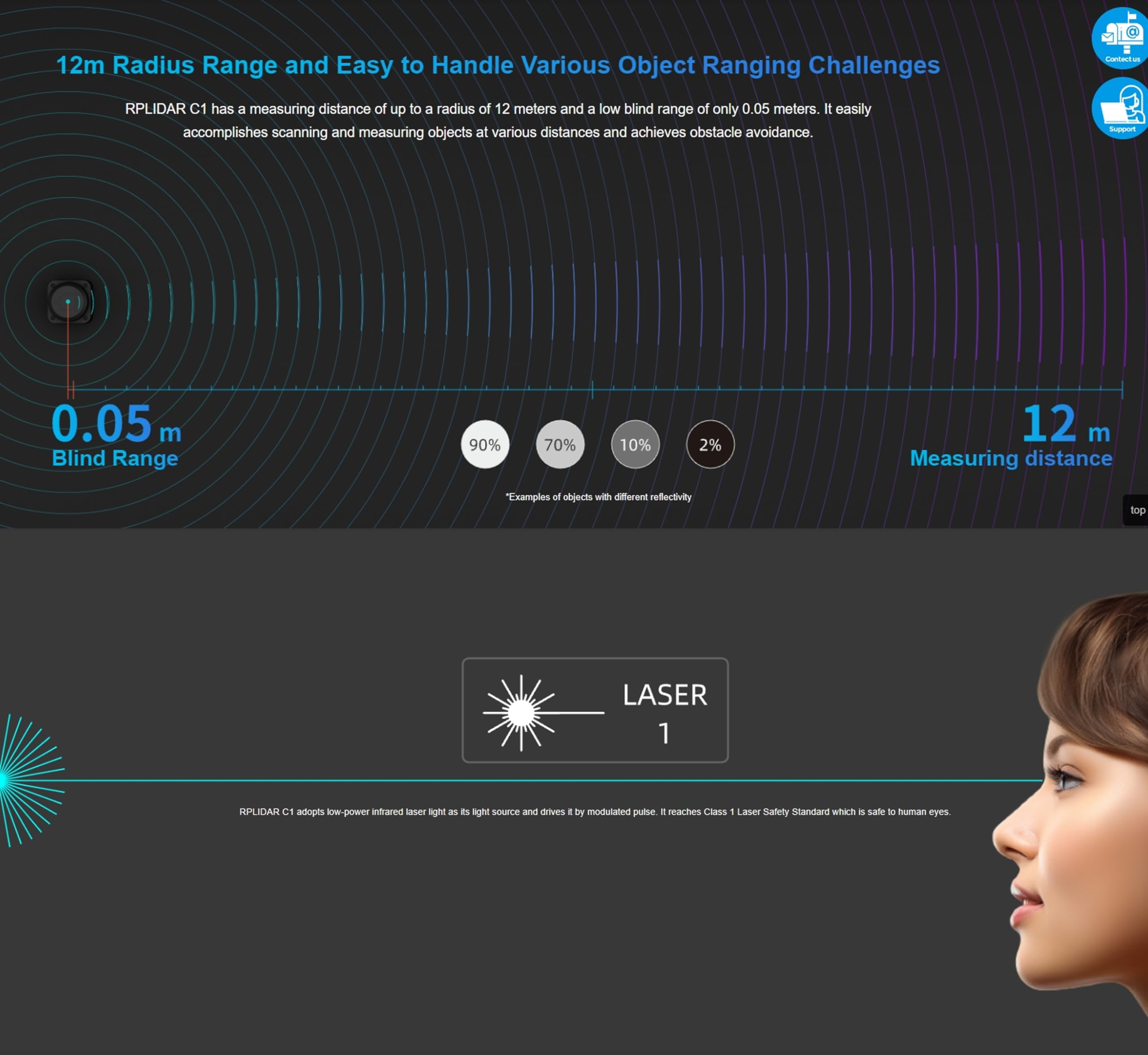 The new generation RPLIDAR C1 Lidar Laser Sensor Scanner of Fusion Type DTOF (Direct Time of Flight) combines years of expertise and delivers exceptional performance in high-resolution detection of small and nearby objects, as well as anti-interference and anti-adhesion capability. With a measuring radius of 12 meters, a sampling frequency of 5000 times per second and a 360 degree full range laser scanner, the compact and agile device meets the requirements of applications such as robot positioning, mapping, navigation and obstacle avoidance in different environments.