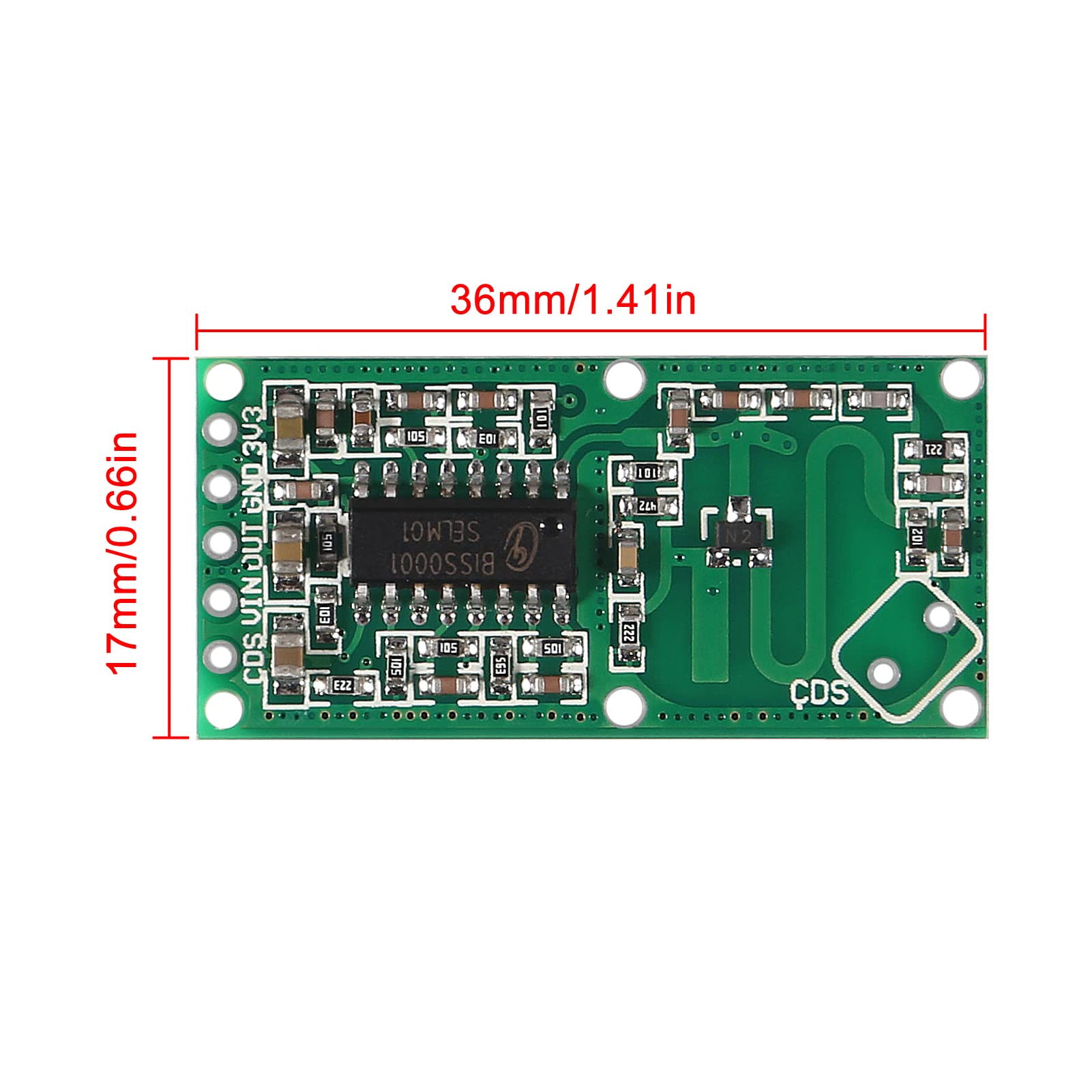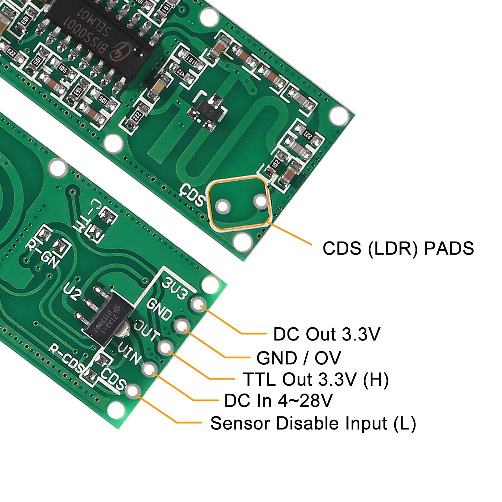 Detection distance adjustment; connect with resistor and detection distance will become shorter; if not connect, detection distance is 7m; if connect with 1M ohm resistor, detection distance is 5m