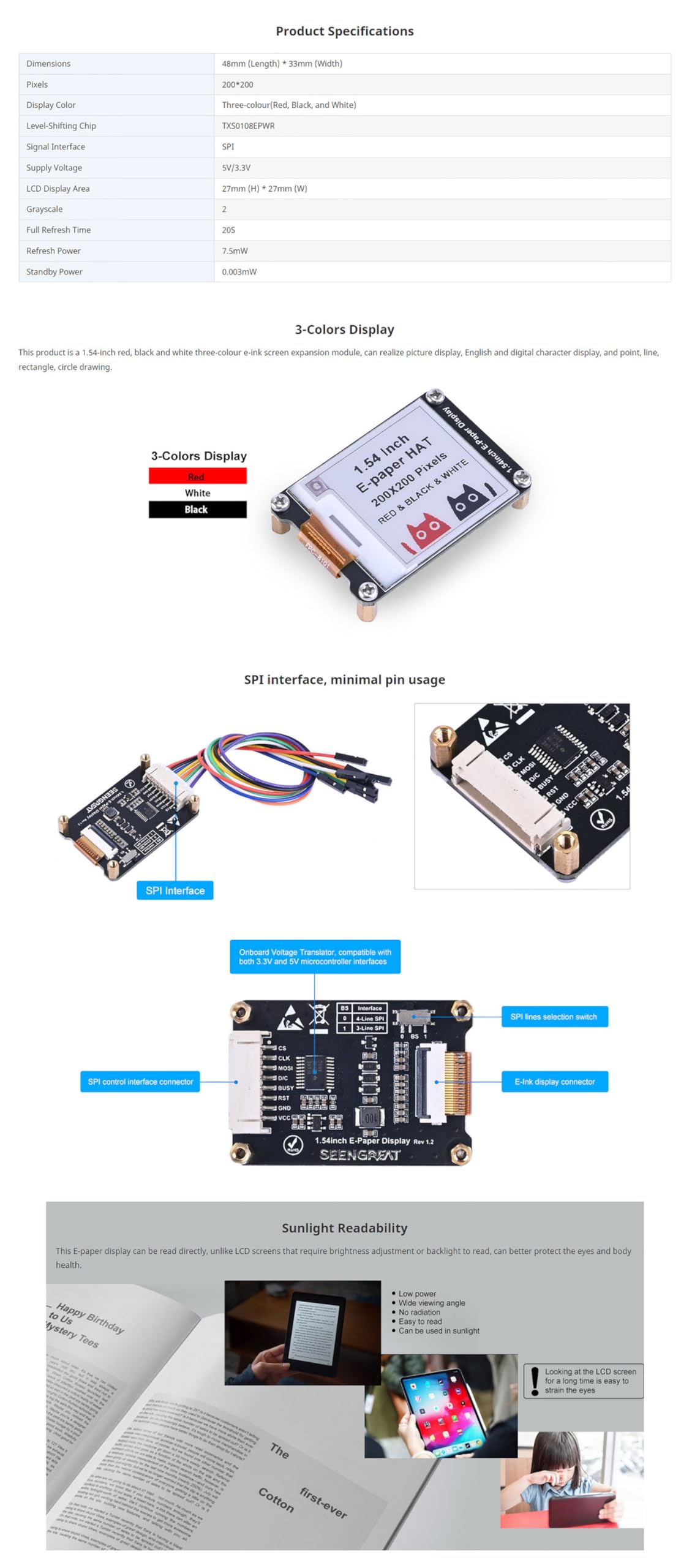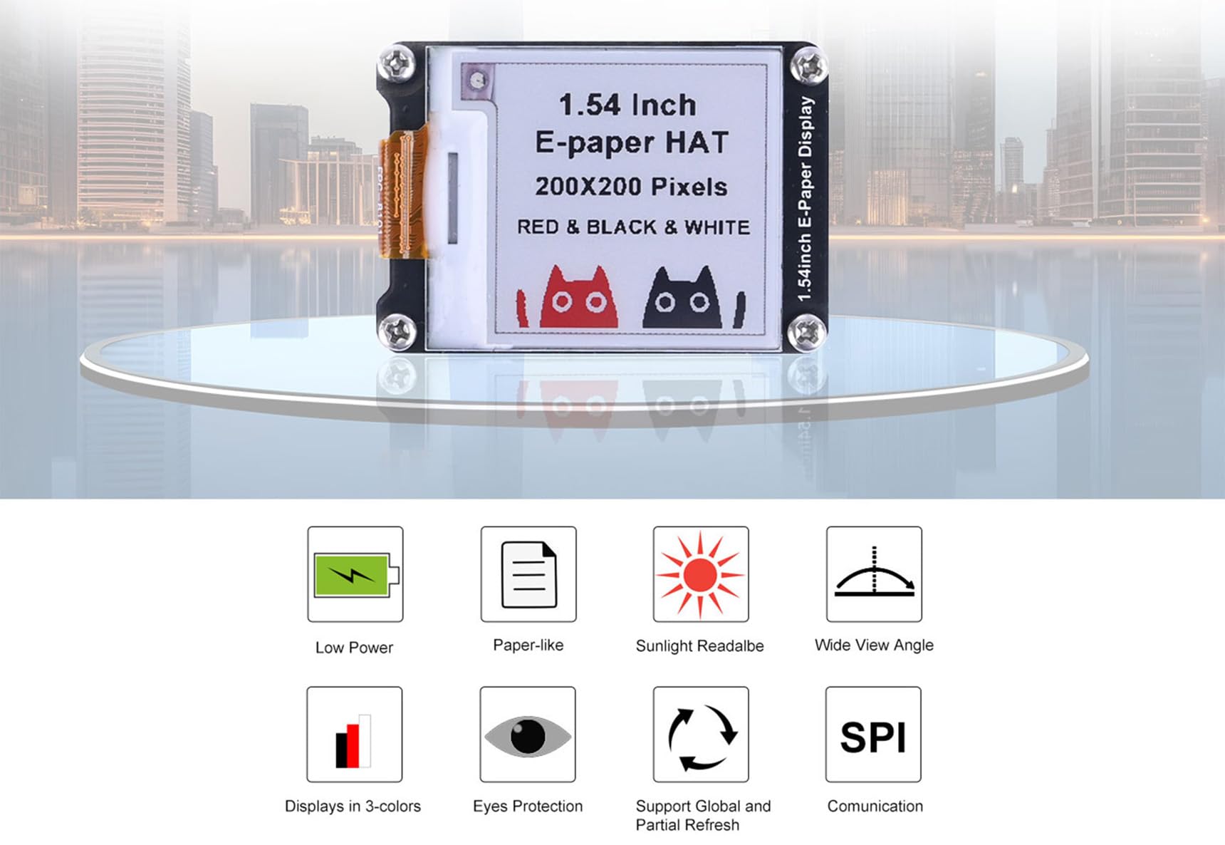 This 1.54inch 3-color e-paper display can be used for price tags, shelf labels, industrial instruments, handheld devices, public information systems, and digital signage equipment, as well as shipping container labels, shop floor conveyor systems, warehousing operations, and more.