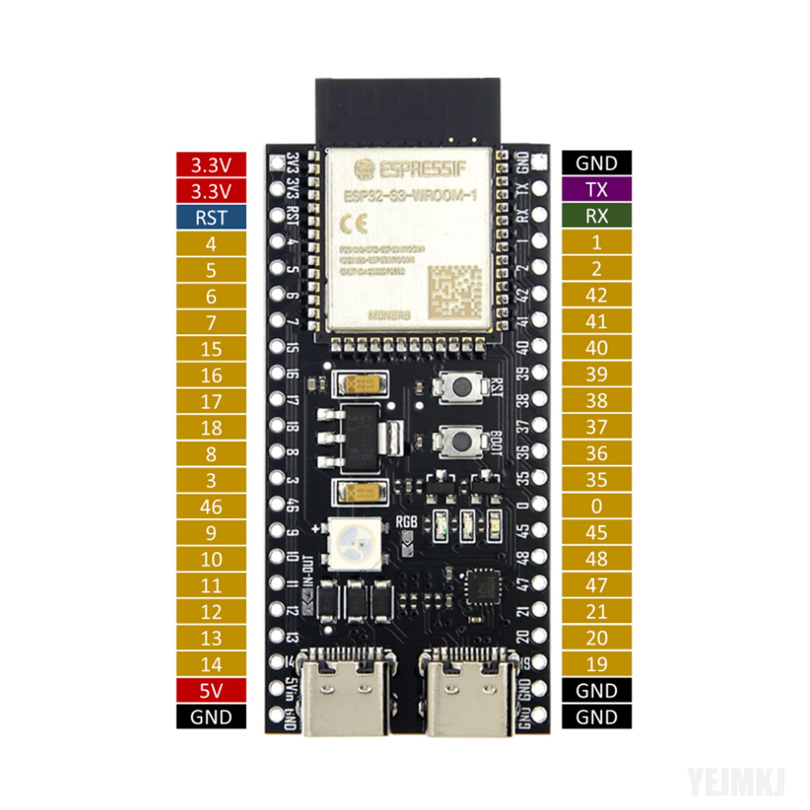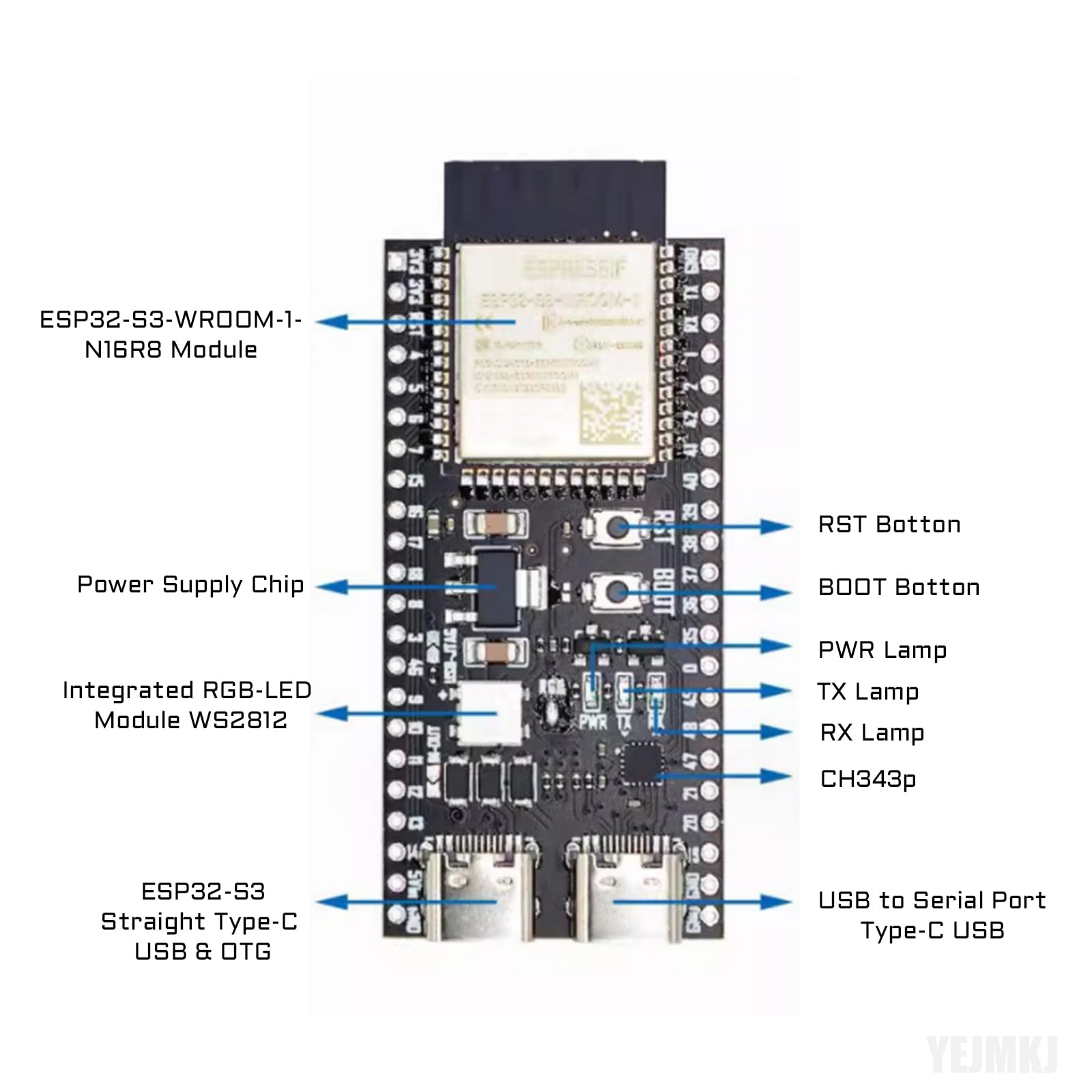 YEJMKJ 3pcs ESP32-S3-DevKitC-1-N16R8 Development Board ESP32-S3-WROOM-1 Cores Microcontroller Processor, Dual Type-C 2.4 GHz WiFi + Bluetooth 5 MCU Module Integrates Complete Wi-Fi and BLE Functions