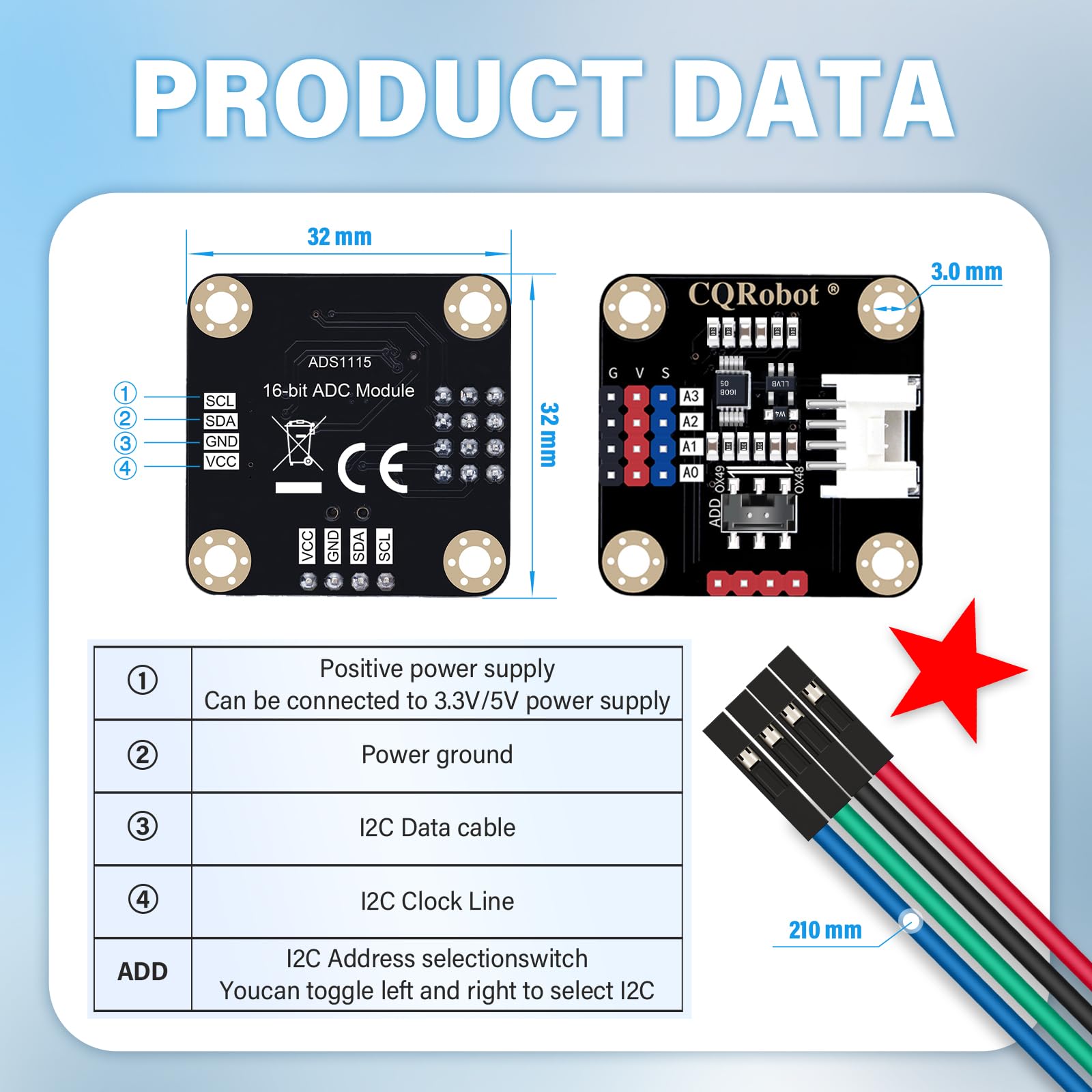 CQRobot ADS1115 16-Bit ADC Conversion Module Compatible with Raspberry Pi and Arduino Boards. Achieve Analog and Digital Signal Acquisition or Conversion, 3.3V to 5V, I2C Address Selection Switch.