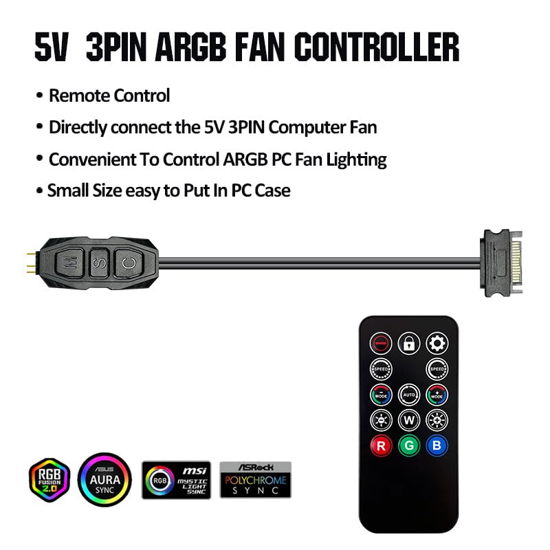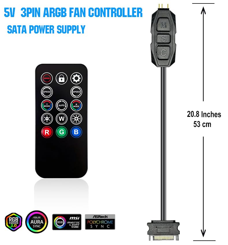 【5V 3Pin ARGB controller】This argb pc fan controller has a built-in lighting effect mode, connected to the chassis power SATA interface for power supply, support all of PSU models that input SATA connector.