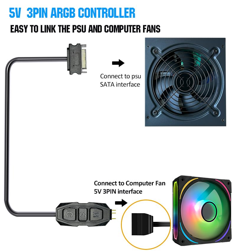 【Widely Compatibility】One side connect to 5V ARGB 3Pin equipment and another side connect to SATA power, The rgb led controller can be used in RGB fans, PC fans, PC RGB, pc led strip, GPU support, rgb psu cables, water cooler cpu, cpu cooler that all 5V 3PIN interface..