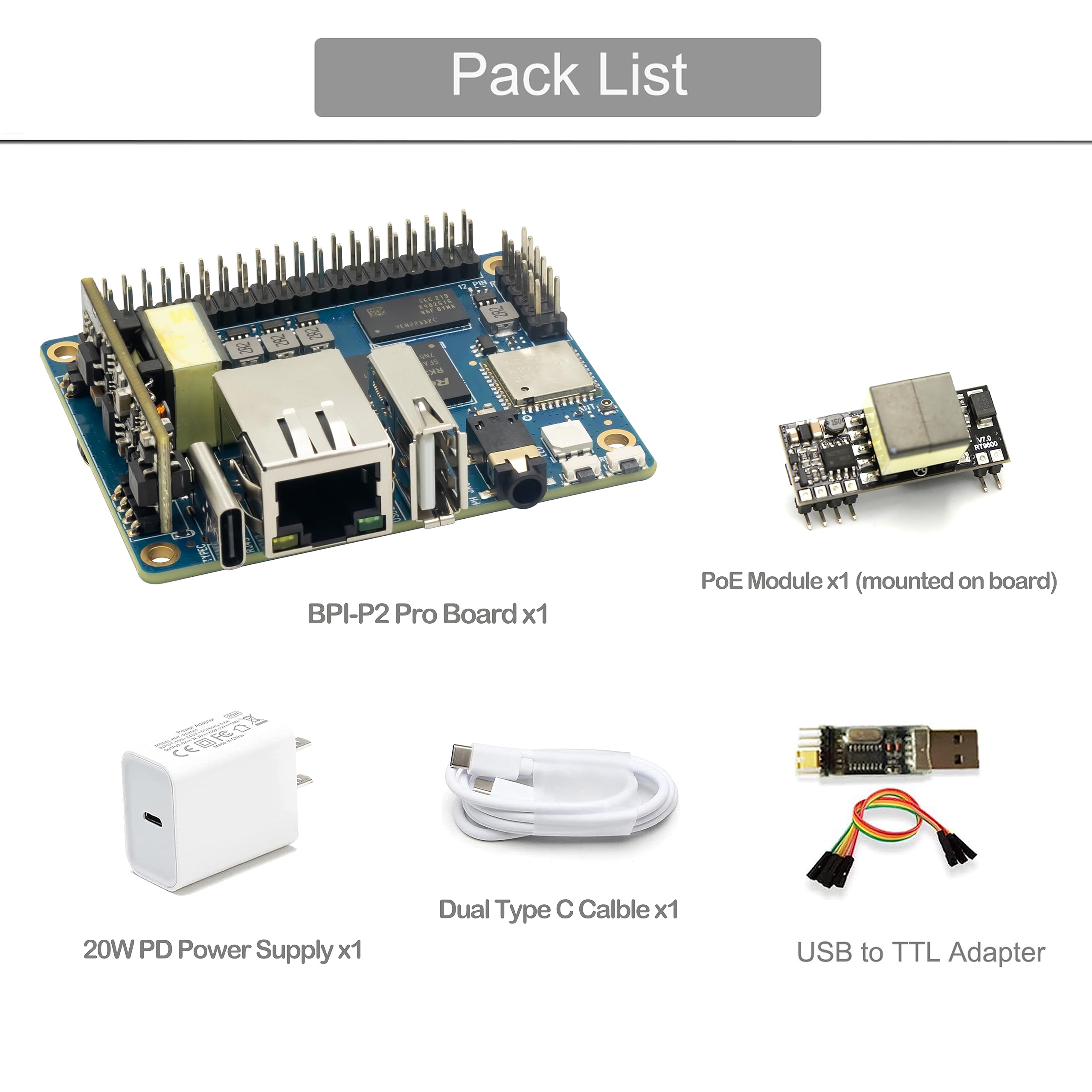 | Included Components | BPI-P2 Pro x1, Debugger x1, PoE Module x1, 20W PD Power Supply x1 |