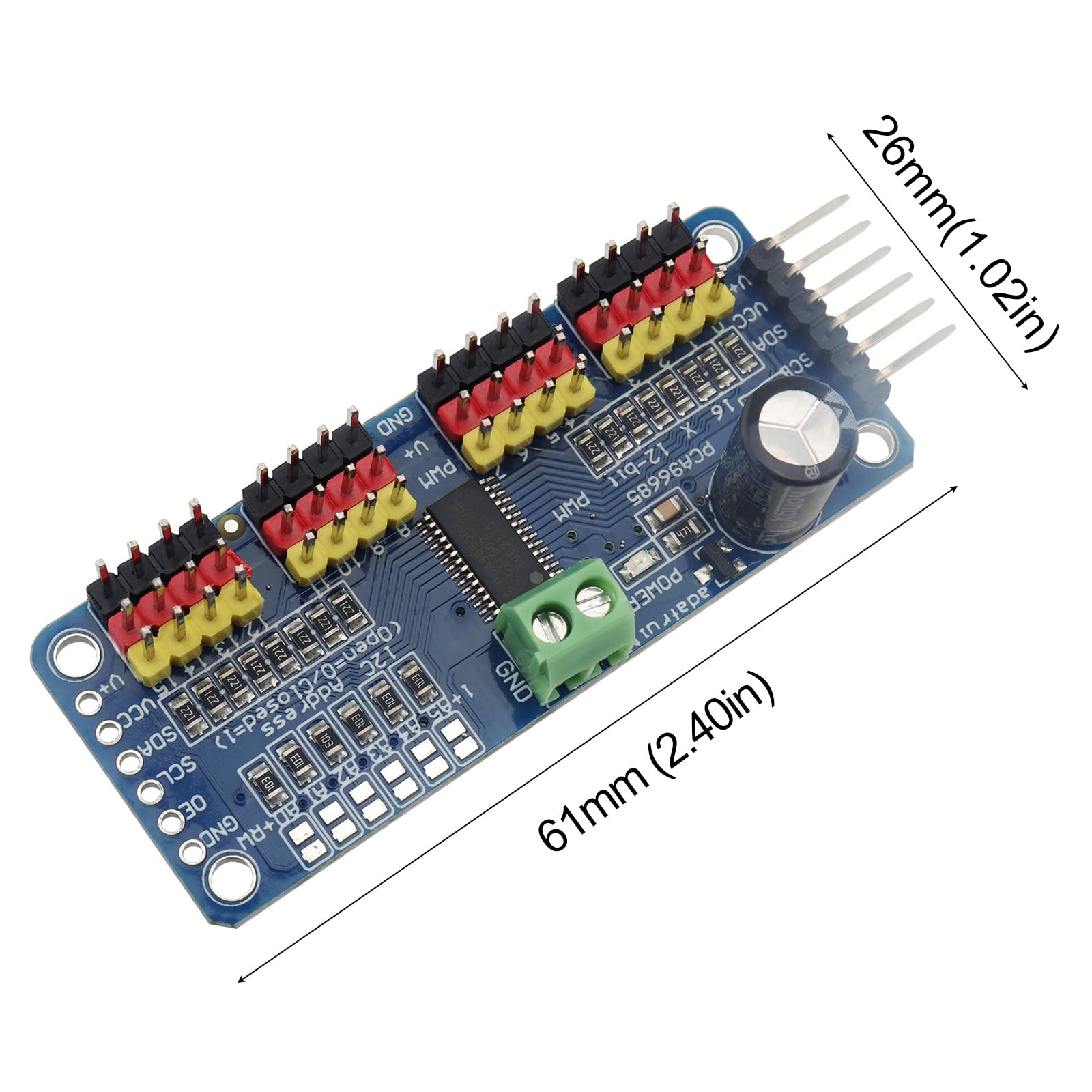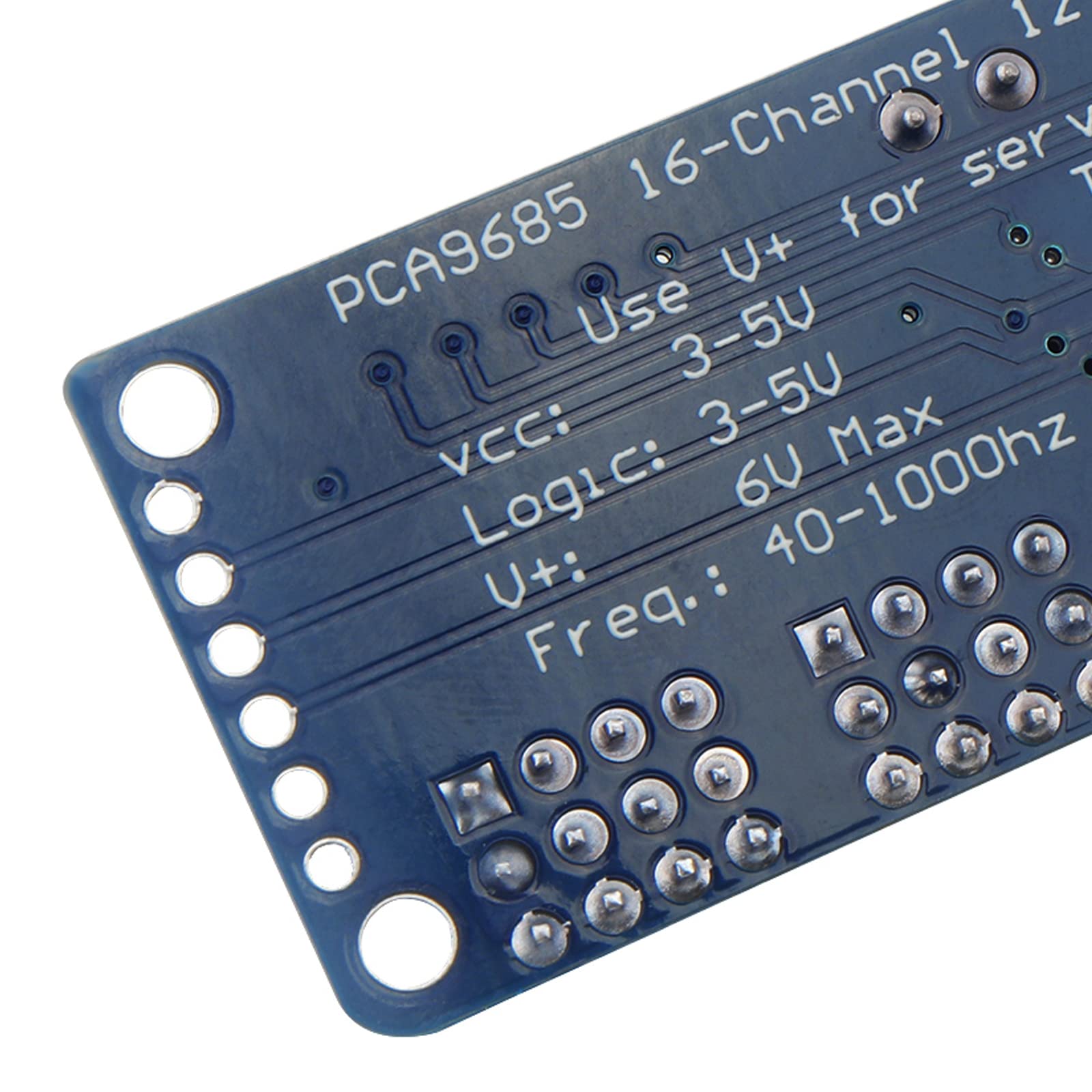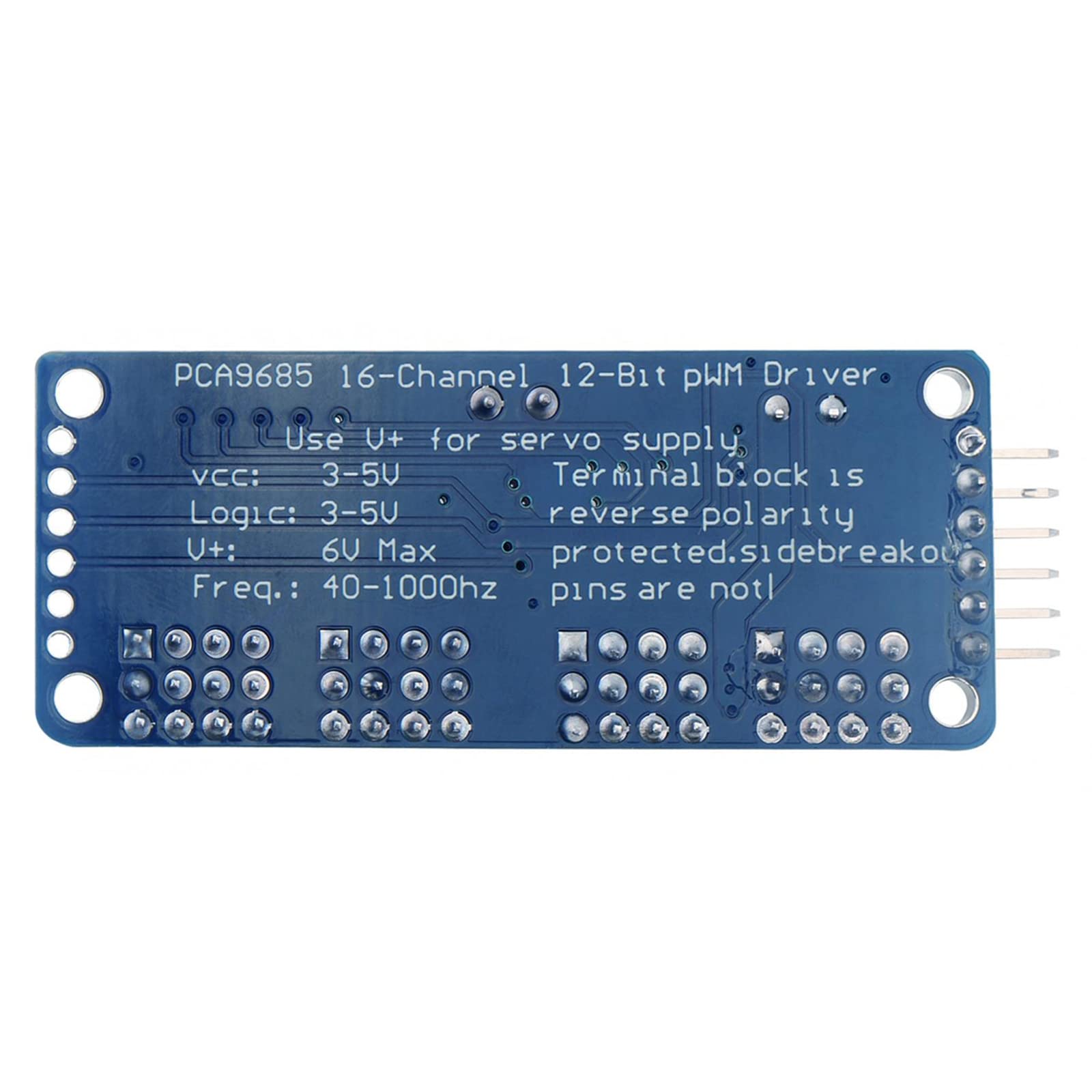 - You can insert 16 servo motors at a time in 4 sets of 3-pin connectors (servo motor plugs are slightly wider than 0.1, so you can fit 4 pairs of 0.1 connectors).
