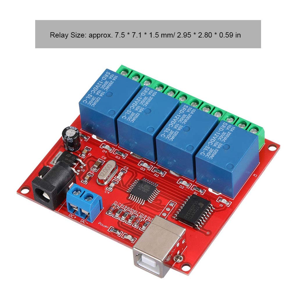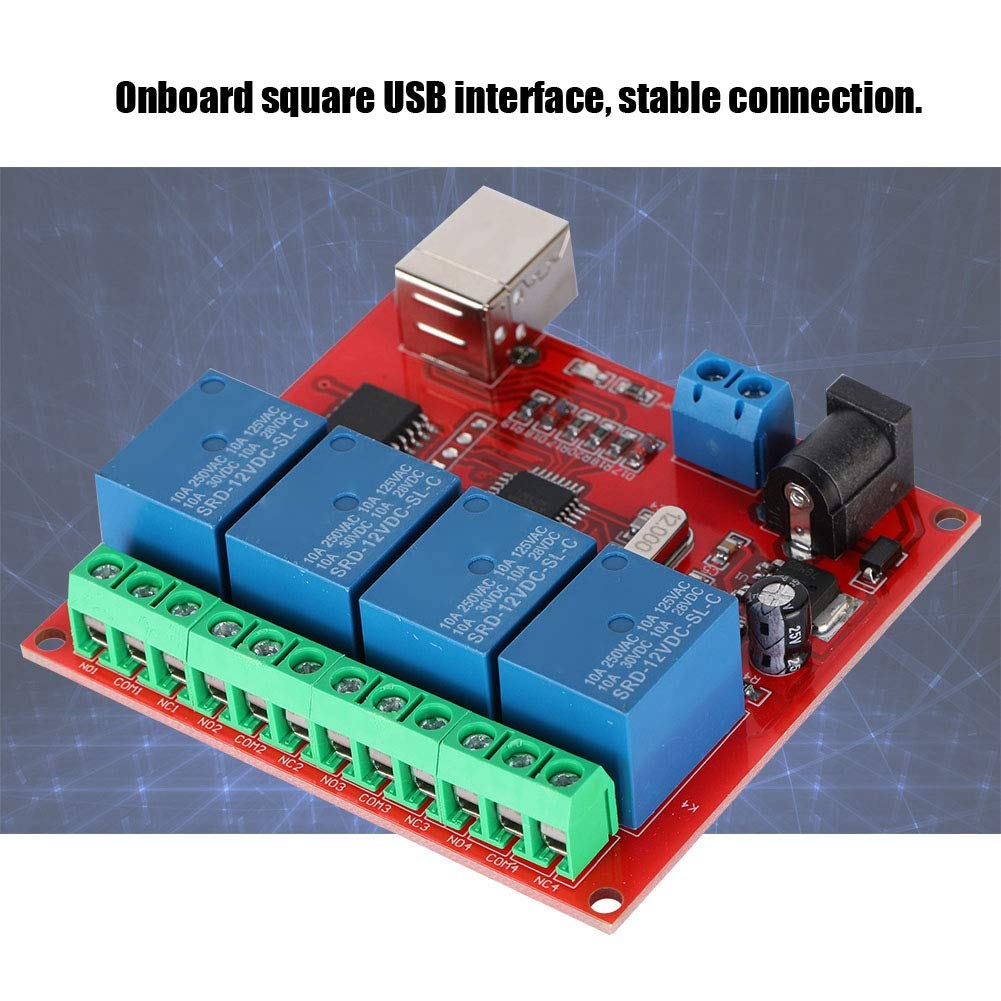 Onboard square USB interface, stable connection. Use imported high performance USB control chip. Use the special relay drive chip ULN2803, the relay works more stable. Militarygrade PCB board production. Board power socket and terminal, two ways to access the power supply are convenient and flexible. When the power is connected, the relay can remain set even if the computer is turned off or the USB is unplugged from the computer.
