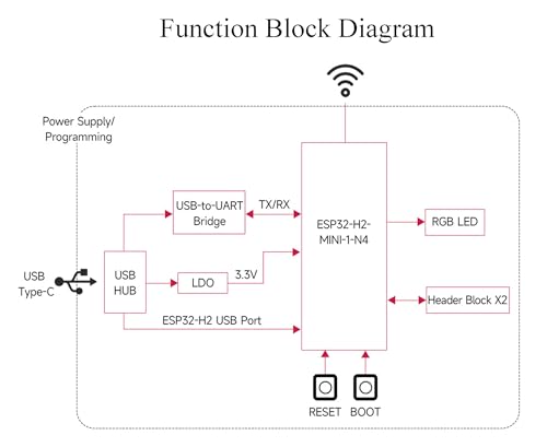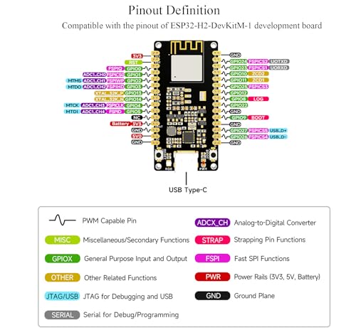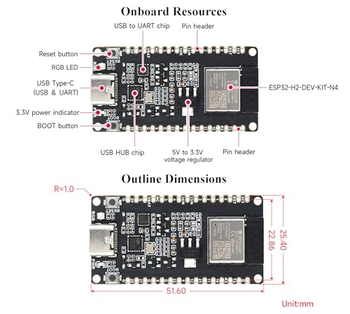 Adopts ESP32-H2-MINI-1-N4 module, which is equipped with RISC-V 32-bit single-core processor, up to 96MHz main frequency, built-in 4MB Flash; Integrates rich peripherals including SPI, UART, I2C, I2S, LED PWM, ADC and other interfaces; Onboard CH343 and CH334 USB HUB chips, supports USB and UART development at the same time via a USB-C port. Compatible with the pinout of the ESP32-H2-DevKitM-1 development board, more convenient to use and expand a variety of peripheral modules.