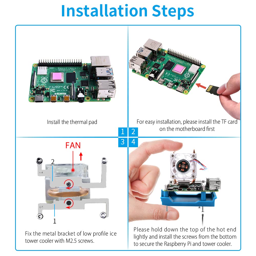 Better Heat Dissipation – The ICE Tower Cooler is made from 5mm copper tube and 28 aluminum fins and it also has a 40mm cooling fan. All are good for heat dissipation of Raspberry Pi Board.