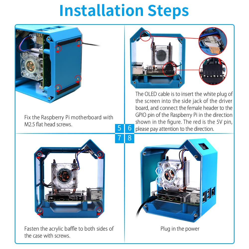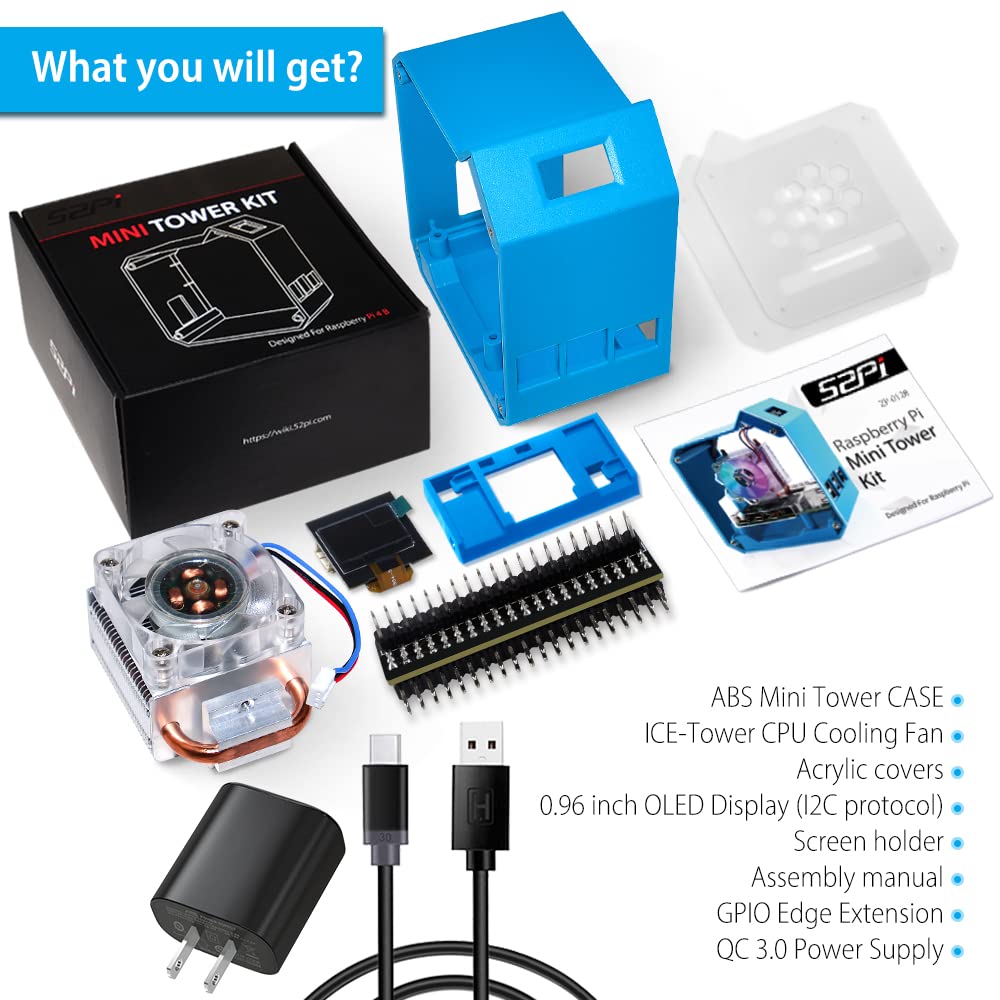 NOTE: The RGB lights on Fan and mood lights on OLED screen driver board will not light up unless installed driver, and OLED will not display any information until you have enabled it! Please read the manual carefully and follow the steps to enable it. Package Includes: 1 x ABS Mini Tower Case, 1x QC3.0 Power Supply, 2 x Acrylic Side Panel,1 x 0.96 Inch OLED Display (already mounted on the case), 1 x ICE Tower Cooler, 1x GPIO Edge Extention,1x Assembly Manual (Note: Raspberry Pi 4B is Not included in the package)