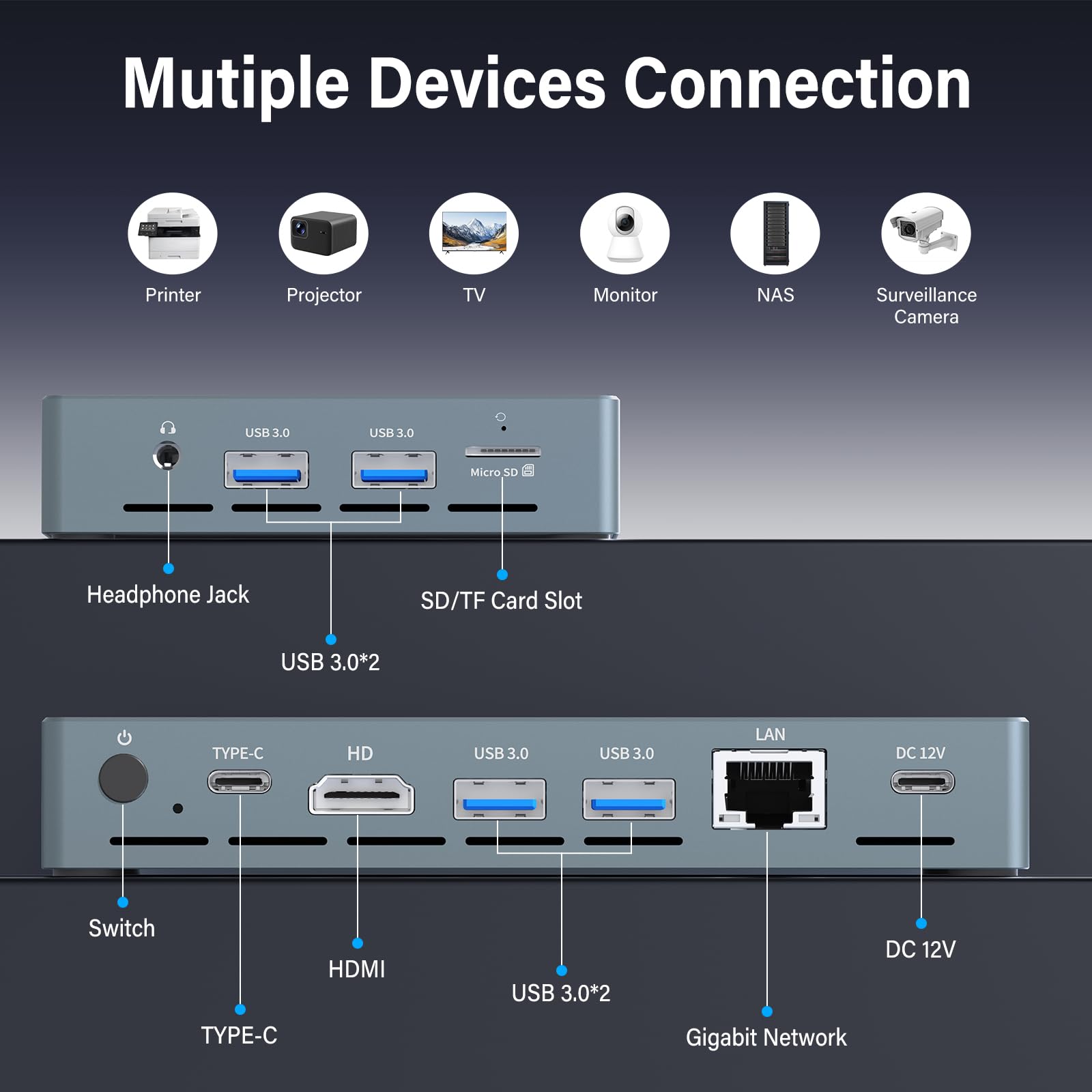 【Rich Build In & I/O Ports】Handheld pc all important connections are available,1 x TYPE-C(Full function),4 x USB 3.0,1 x HDMI 2.0,1 x RJ45,1 x Headset,1 x SD card Shot,1 x DC Port(12V),If mini PC ports are not enough for our daily computer use,we can connect the expansion port through the full-featured USB C port.supports Wake on LAN , PXE, Auto Power on, RTC Wake Settings built-in audio, built-in microphone.