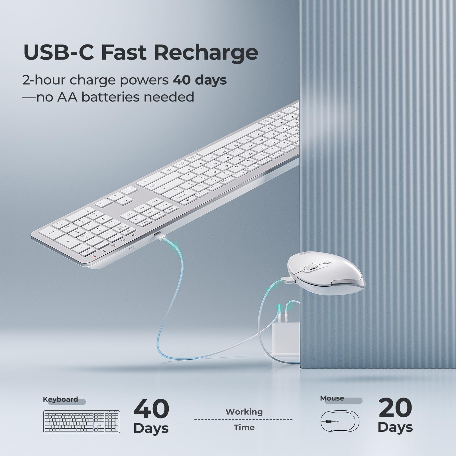 【USB-C Rechargeable & Eco-Friendly】: Fully charge in 2hrs via the included USB-C cable; enjoy up to 45 days of keyboard and mouse use—no more buying AA batteries.