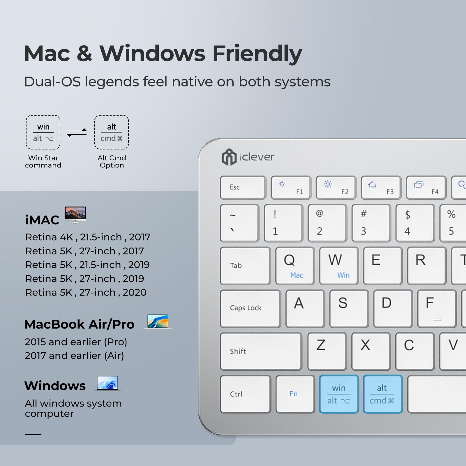 【Mac & Windows Dual-Layout Compatibility】: Clearly printed Mac ⇄ PC legends plus automatic OS recognition let you switch between MacBook, Windows laptop, desktop, or Chromebook without relearning shortcuts; includes washable dust cover for easy care.