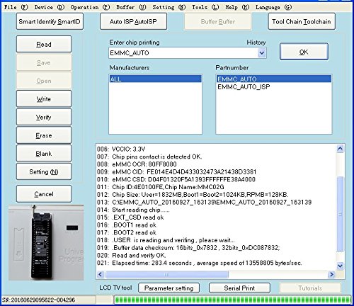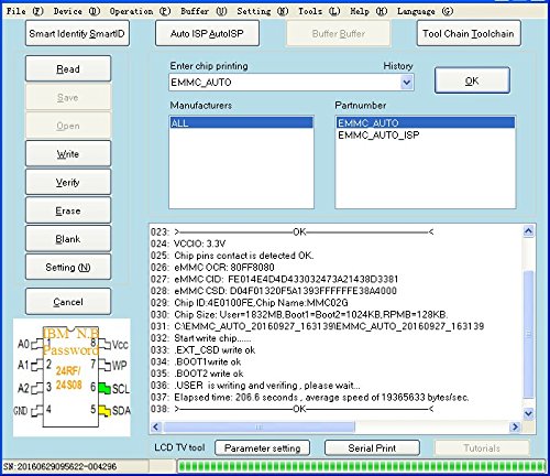 Five special features 1: Intelligent perception, the chips are placed arbitrarily on the locking seat (NAND chips need to be placed according to the orientation), common memory does not need Look at the direction, even if it is reversed, it will not burn the chip and can read and write normally! And intelligently identify the memory model, more suitable The operation should be learned with novices. 2: NAND_AUTO, which can identify most chips, and then perform read and write operations. 3: EMMC_AUTO_ISP, can identify most chips, and then perform read and write operations 4: Deep sleep function, when turned on, close the software and automatically turn off the power of the programmer. 5: SELFTEST, the self-test test can detect whether the programmer is faulty. When most types of chips are read and written offline, they support the functions of intelligent identification and random placement ·High-speed USB interface, WHQL certified USB driver, read and write speed up to 25MB/S ·All-wheel drive architecture, free software upgrades, universal adapters as much as possible, reducing usage costs for users The Only universal programmer which can automatically detect chip number for all Chips. The only universal programmer which can put ic in any position and make intelligent sense. The Only universal programmer Support Read and program Laptop I/O via keyboard line. The Only universal programmer Support Read and Program LCD TV VIA VGA and HDMI PORT. Support UPTO 64GB NAND FLASH Short description: · 48-pins powerful pindrivers, no adapter required for any DIL devices · ISP connector for in-circuit programming · VGA port to read and write LCD TV-MONITORS without disassembly . · HDMI port to read and write LCD TV-MONITORS without disassembly . · Connection to PC: USB 2.0 (up to 480 Mbit/s, high speed/full speed) and 1.1 compatible interface · The Only universal programmer Support ADD new flash by yourself without wait for factory. The Only universal programmer built in Most of