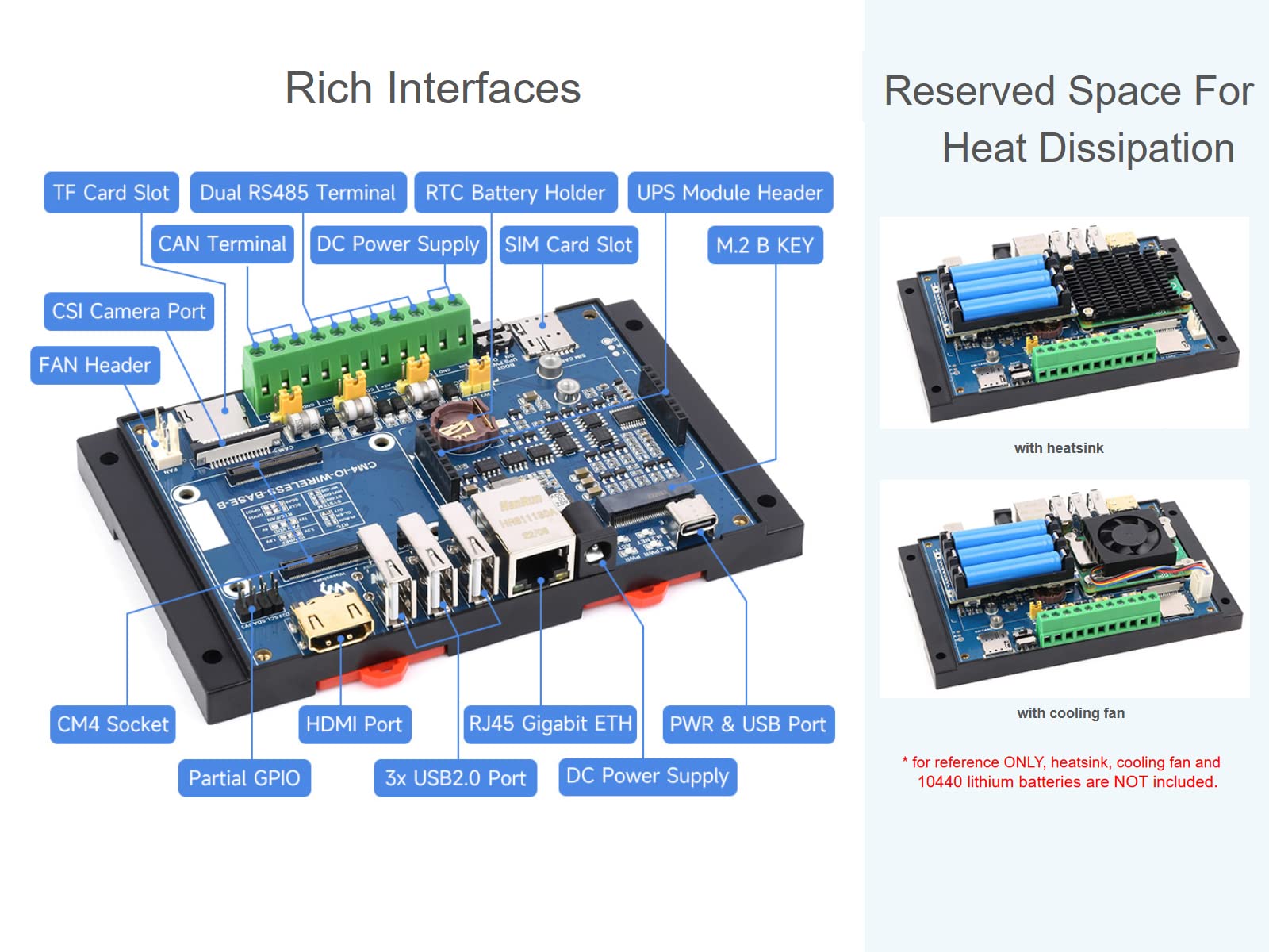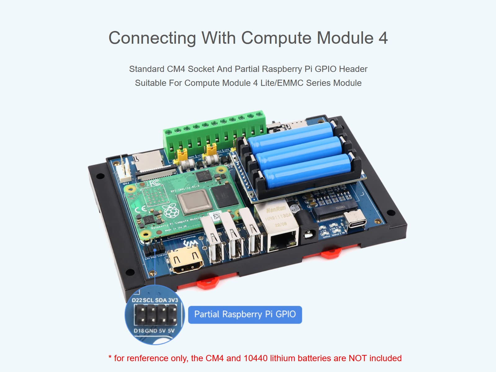 This is an industrial expansion module based on Raspberry Pi CM4 with UPS module, which features common interfaces such as Gigabit Ethernet, HDMI, USB, and GPIO, allows additional 4G / 5G wireless communication modules to be connected via the M.2 B KEY socket. There are also industrial interfaces/resources including RS485, CAN, and RTC.
