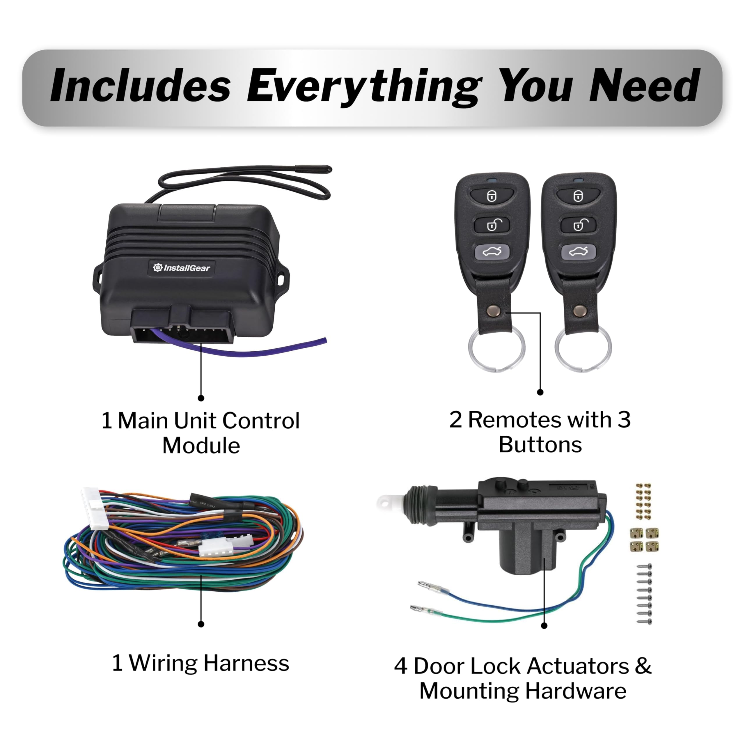 InstallGear Keyless Entry System With Two 3-Button Remotes and 4 Door Actuators - Central Locking System for Car, Auto, Truck - Power Lock Kit