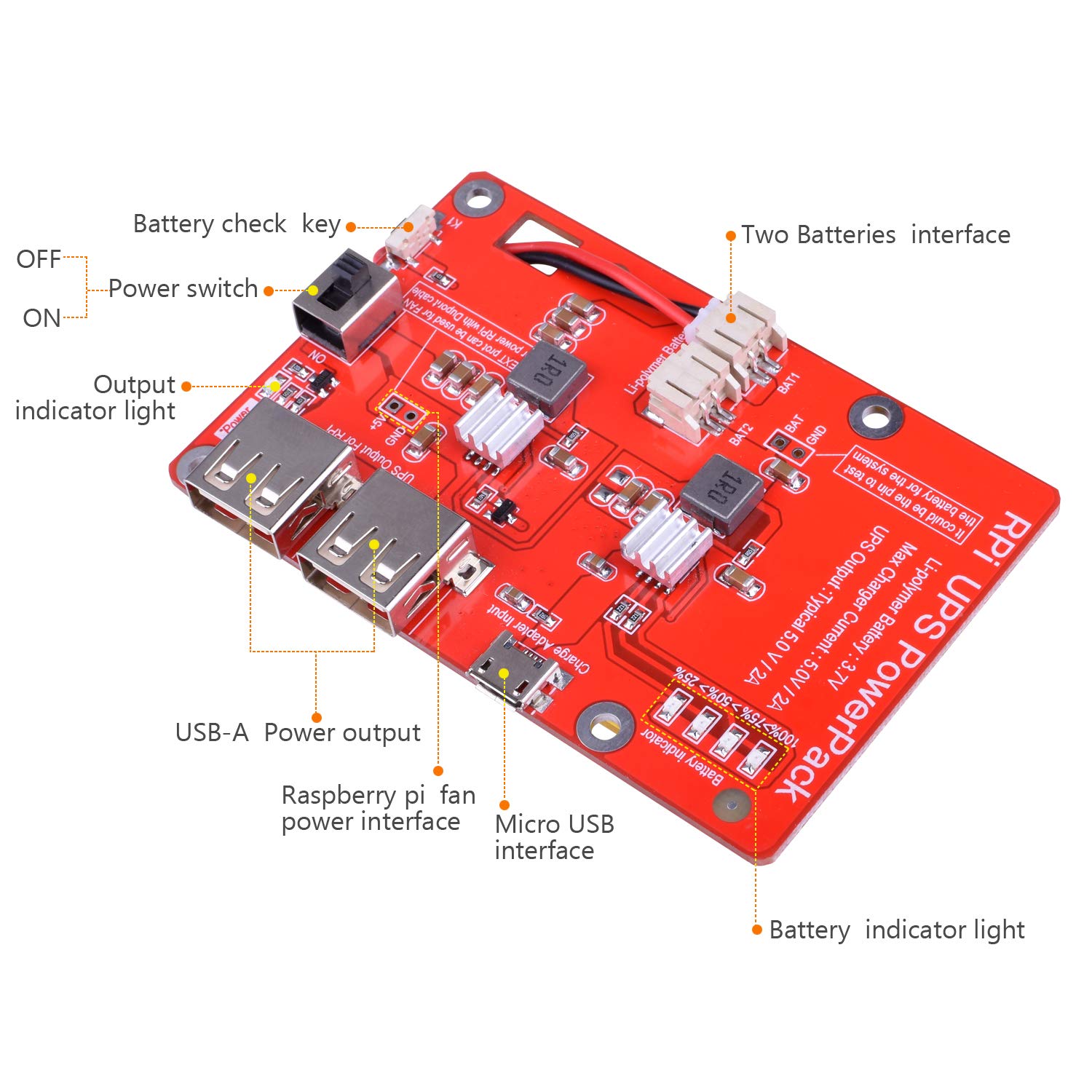 Features: ·Support UPS function, output DC5V while charging(will not be interrupted). ·With battery detection interface, always check the battery's power. ·The power-on state can automatically detect the load and start the output function, and automatically turn off the output when there is no load. ·The size and mounting holes are exactly the same as the Raspberry Pi for easier installation and use. ·It's convenient to power on / off raspberry pi via battery switch; ·It can last about 9 hours if only pi 3. ·The Lithium battery expansion board can be also used on cellphone.