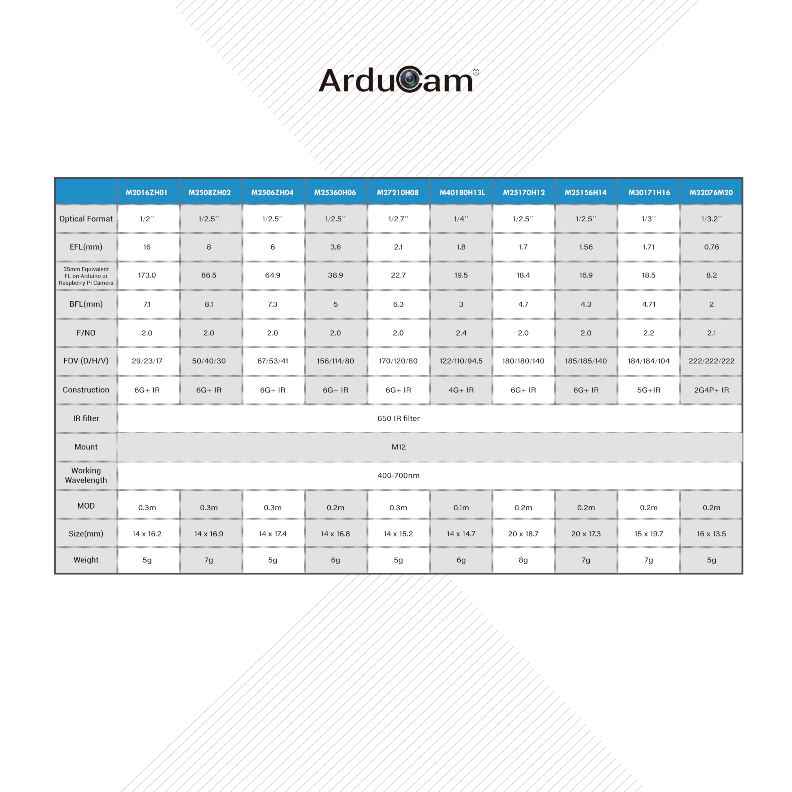 What’s in it: This kit includes 10 M12 Lenses to cover almost any angles of view you’ll ever need, 10°/20°/40°/60°/80°/100°/120°/140°/160°/200° respectively on a 1/4” Pi Camera like OV5647 and IMX219. M12 lens holders, screws, specifications and even cleaning cloth are also in the box