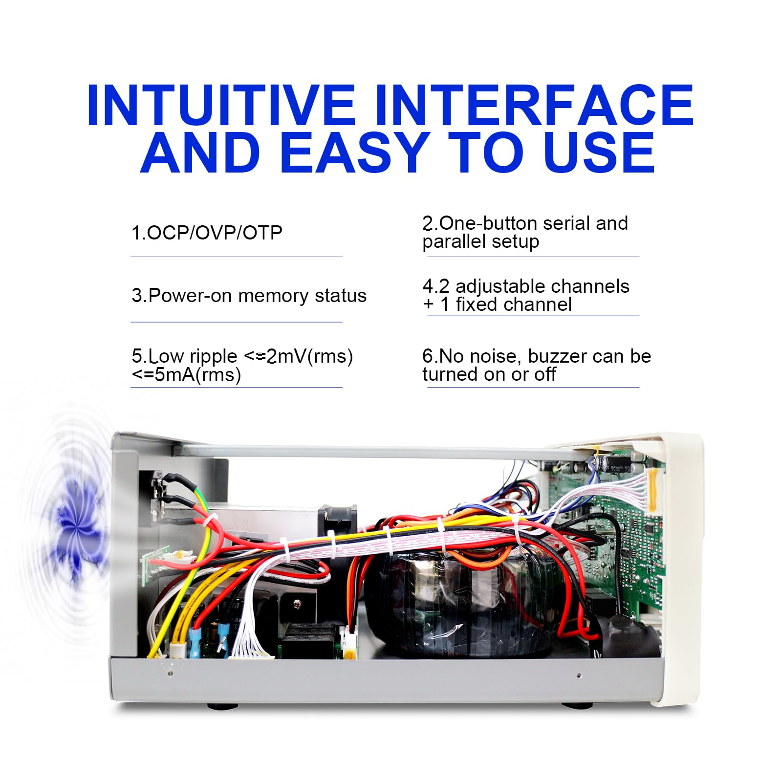 MULTI-PROTECTION FUNCTION: Our adjustable power supply is equipped with grounding wire, overheat protection, overvoltage protection, overcurrent protection, and short circuit protection to ensure safety; after testing, it can maintain full load operation for more than 24 hours. The benchtop power supply built-in smart cooling fan can reduce noise and effectively extend product life.