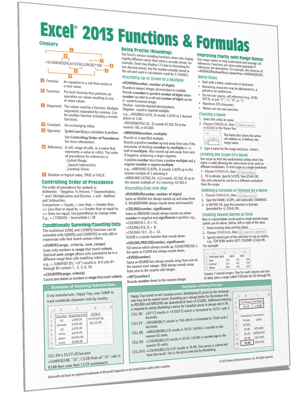 Microsoft Excel 2013 Functions & Formulas Quick Reference Card (4-page Cheat Sheet focusing on examples and context for intermediate-to-advanced functions and formulas- Laminated Guide)