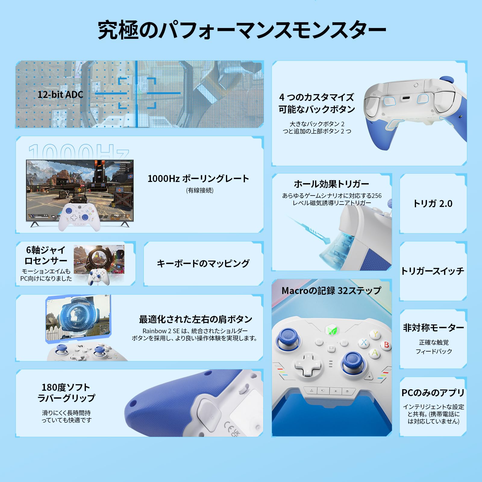 【Multi-platform Gaming Controllers】Wireless PC controller Rainbow 2 SE works for Switch, Windows10&11, Android7.0+, iOS14.0+. PC controllers are designed with 2 custom back buttons, 2 top buttons, motion aiming, Turbo, Marco, dual motor, hall-effect triggers, 3 sets of joysticks, 4-way & 8-way D-pads, 1000Hz wired polling rate, 2000 levels axis resolution, built-in Bluetooth, keyboard mapping, App on PC (Not support on mobile). Rainbow 2 SE supports Black Myth: Wukong. 【Audio is NOT supported】