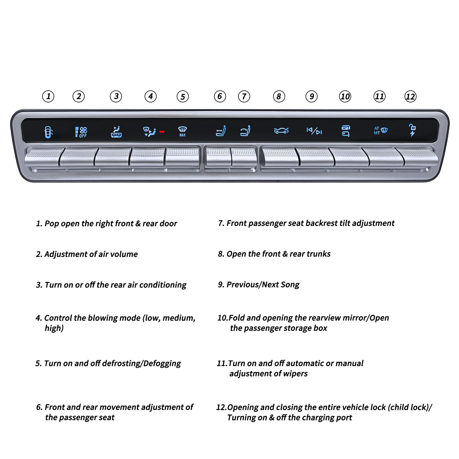 [Tesla Physical Control Buttons] - 12 Button Shortcuts allows you to complete the most important functions, including defrost on/off, defog on/off, air conditioning control, wiper on/off, wiper mode change and charger cover open /close.