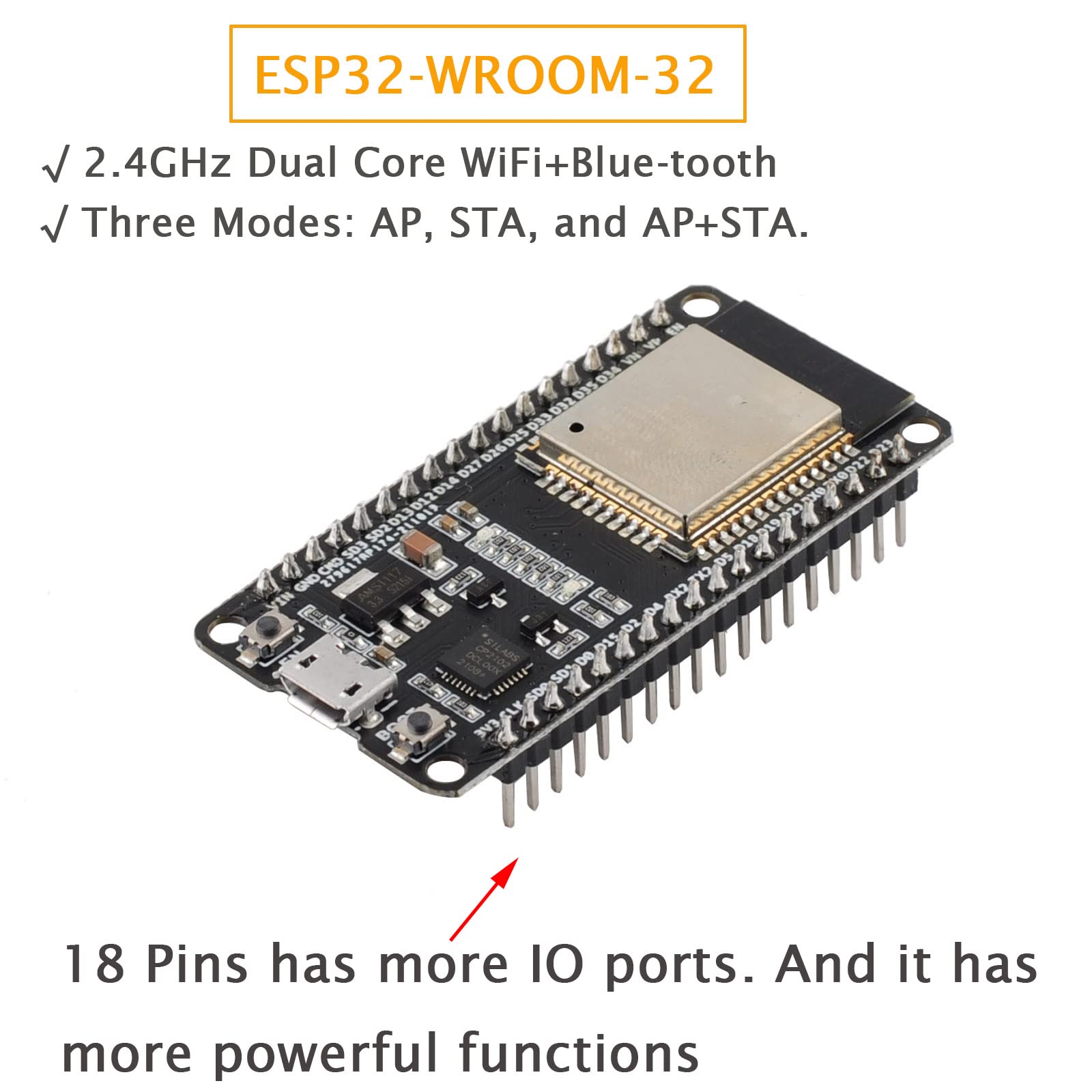 ✨This is 18 pins ESP-WROOM-32 esp32 development board with more IO ports and has more powerful functions.