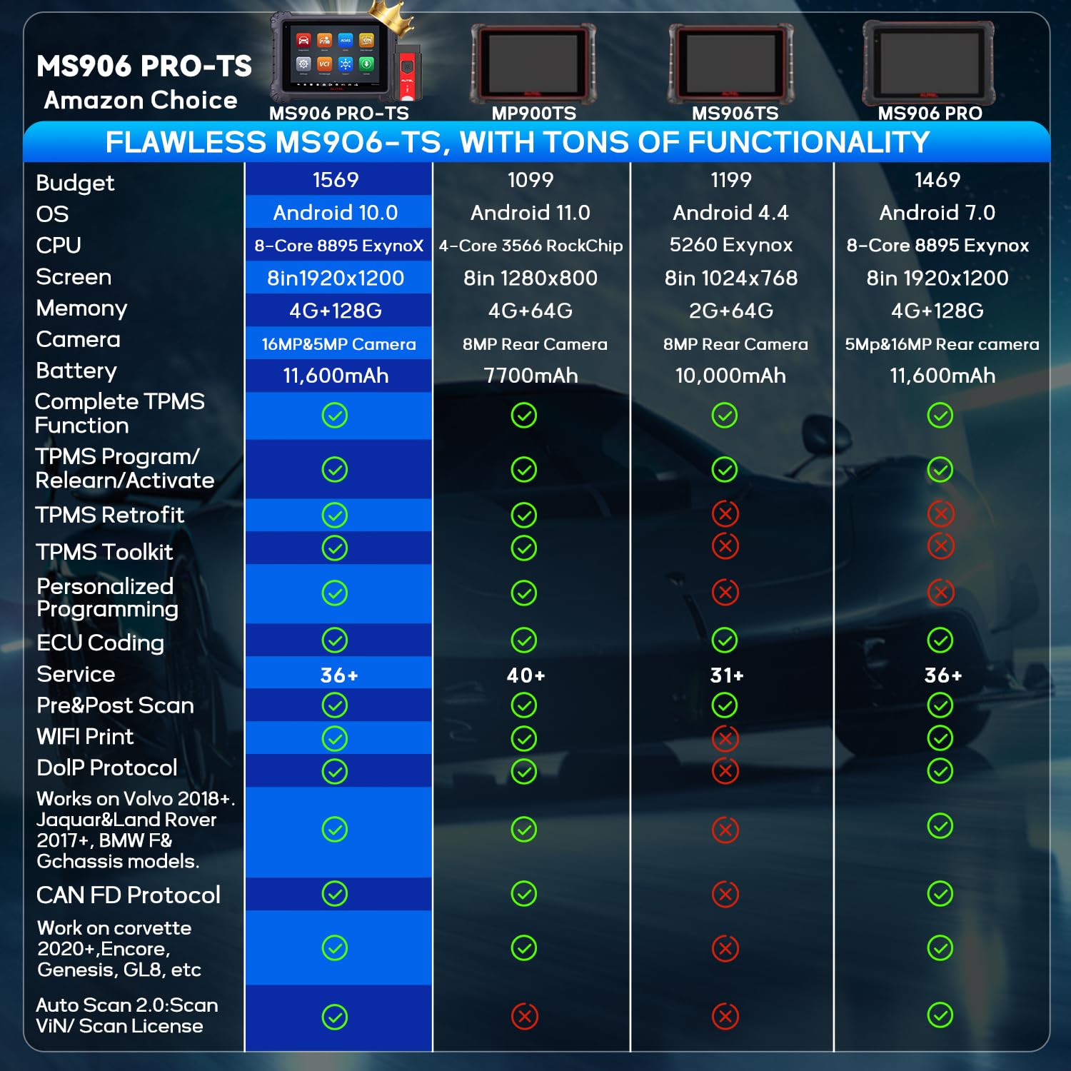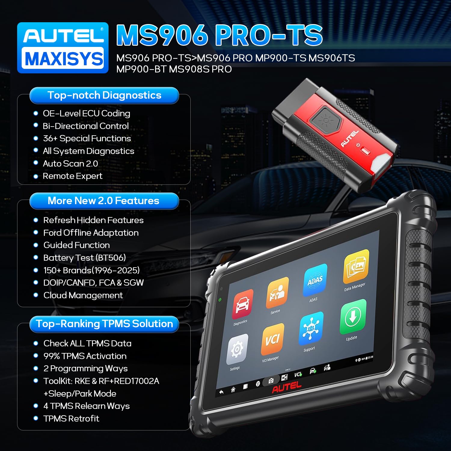 As the upgraded version of Autel scanner MS906TS, Autel MaxiSys MS906PRO TS packs all strengths of MS906S/MK906BT/MS906BT and lately develops the comprehensive TPMS functions. This MS906PRO TS automotive scan tool allows you to employ the intelligence and technology to solve all vehicle issues and improve work efficiency, which is the top ideal choice for diagnostic technicians, garages, TPMS repair shops, etc.