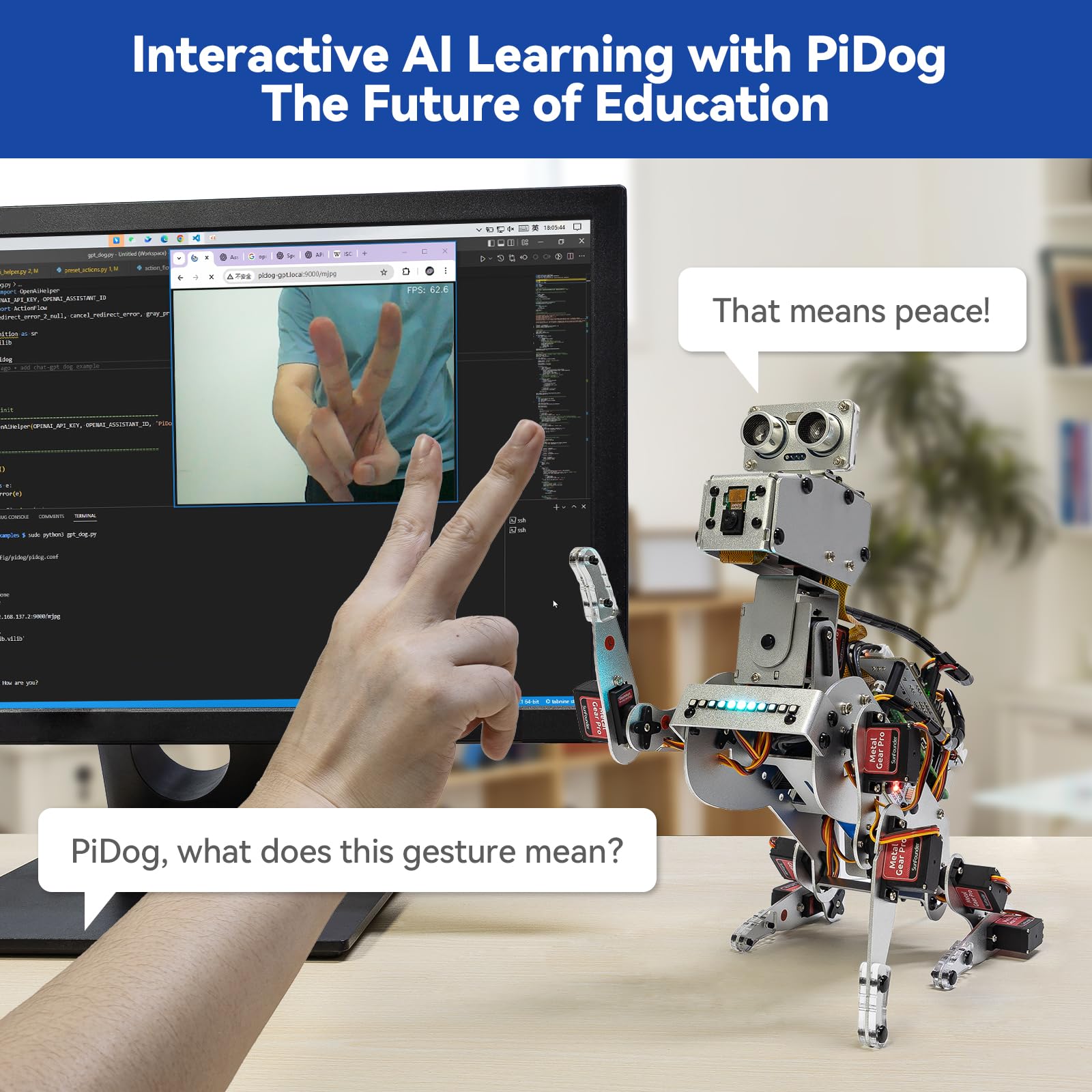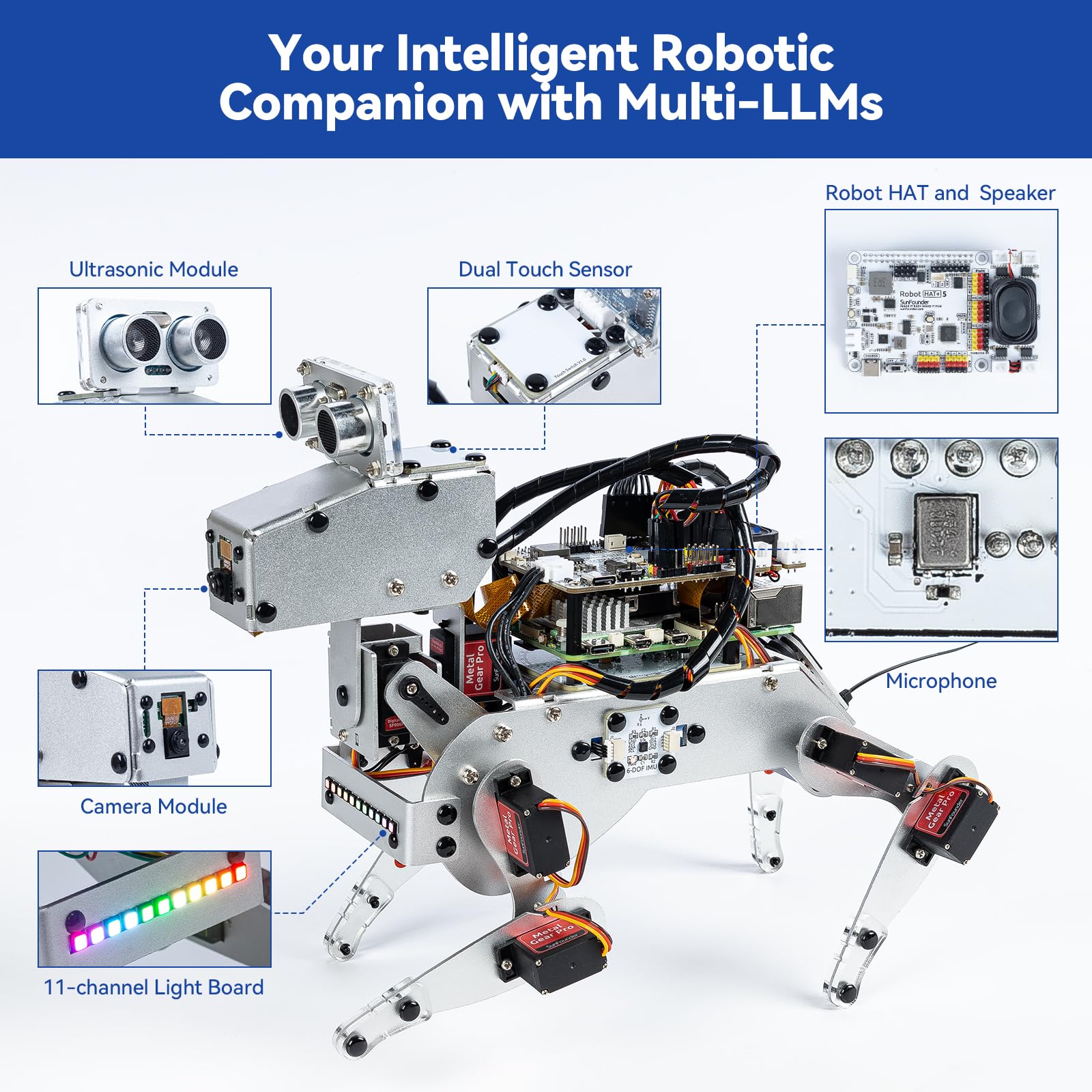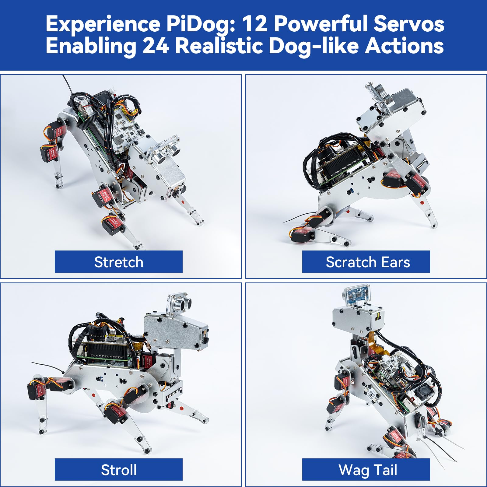 AI-Powered Raspberry Pi Robot Dog — PiDog. PiDog is an interactive AI robot dog powered by Raspberry Pi(5/4B/3B+/3B/Zero 2W) and multi-LLMs like ChatGPT-4o, Gemini, Grok, DeepSeek, Qwen, Doubao, and Ollama.With 12 servos and camera, gyroscope, hearing, and touch sensors, it walks, reacts, and plays like a real dog.Supports OpenCV, MediaPipe, TTS & STT, enabling it to see, listen, talk, and think. Control PiDog via app with real-time FPV and program it using Python. Built-in rechargeable battery.Ideal for students, educators, and engineers. (Raspberry Pi not included)
