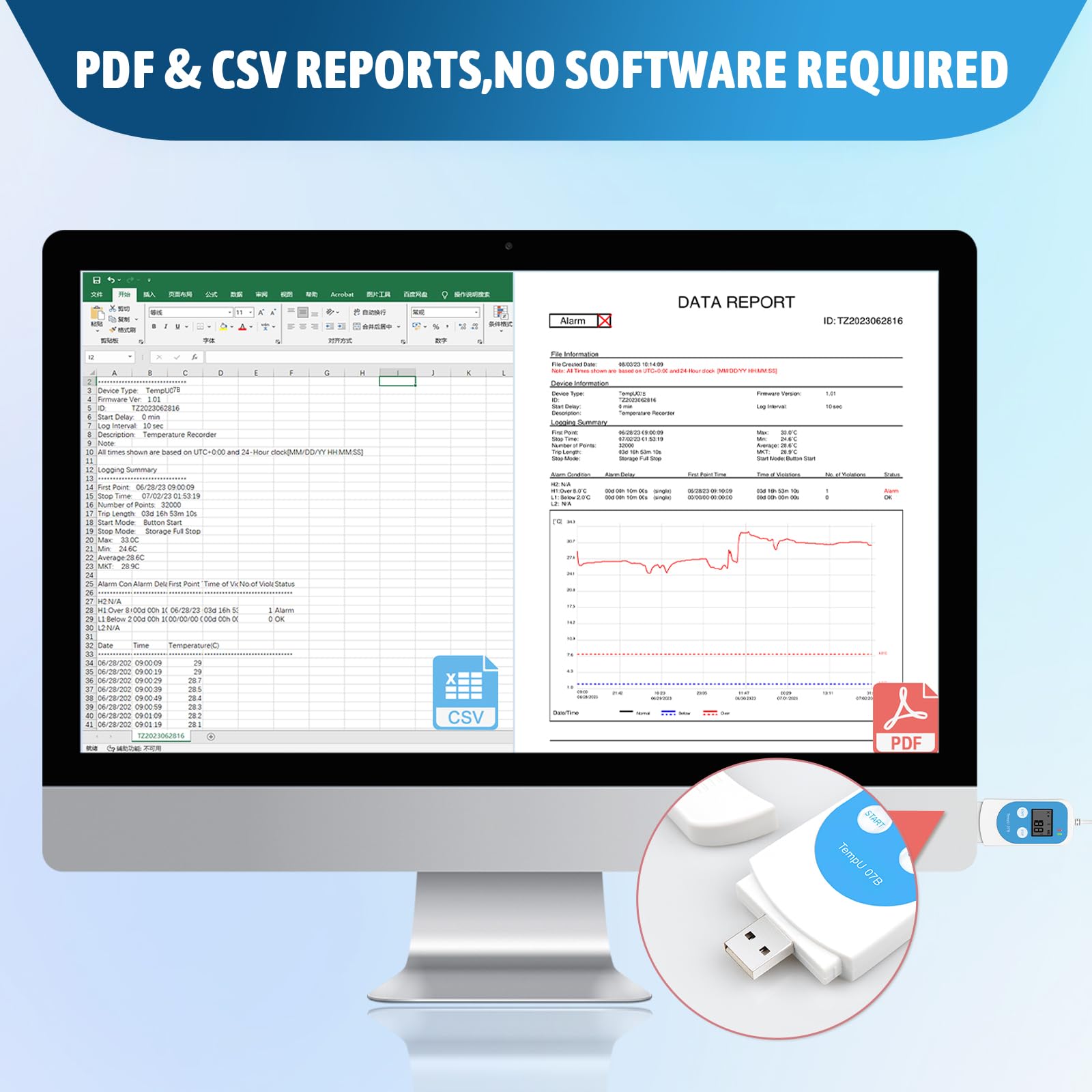 • Auto Reports, No Software Required: Plug the temp logger into a computer via USB port, and you'll get automatically generated PDF & CSV reports without any software; If the report needs to be protected, please set your own password via the free software