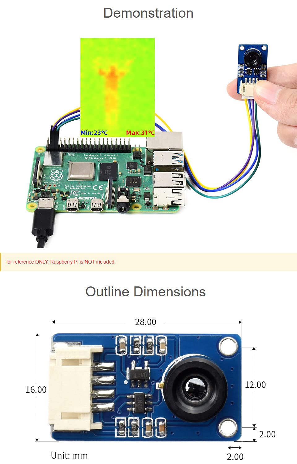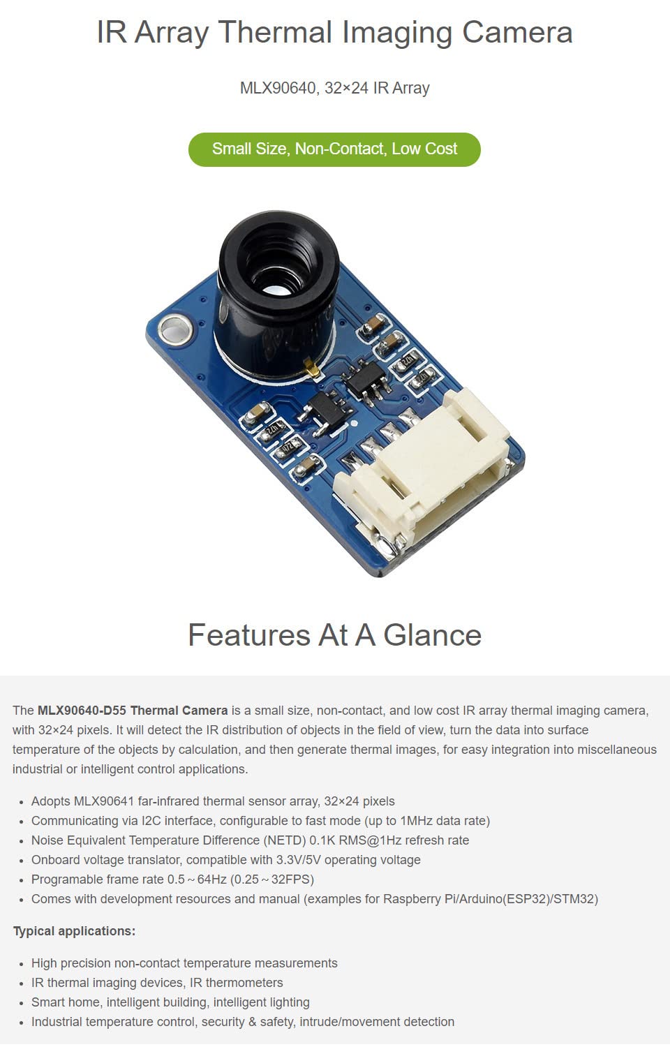 This is a 32×24 pixels, 55° field of view, IR array thermal imaging camera, communicating via I2C interface. It is compatible with 3.3V/5V operating voltage, supports host platforms such as Raspberry Pi/ (ESP32)/STM32, etc.