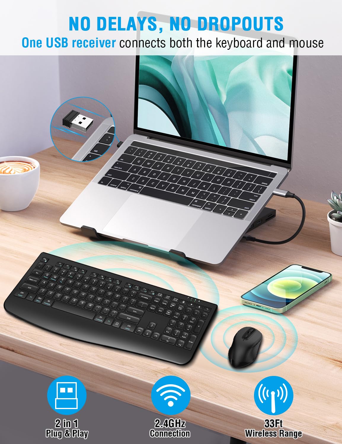 ▶[SILENT DESIGN, LESS NOISE, MORE FOCUS] : Don't worry about disturbing your family when typing or clicking anymore. This wireless keyboard comes with silent and soft-elastic feel keystroke, providing a new wonderful typing experience, and the silent click design of the wireless mouse, quiet wireless keyboard mouse combo reduces noise by more than 95%, allowing you to focus more. So you can enjoy a quiet comfortable typing.
