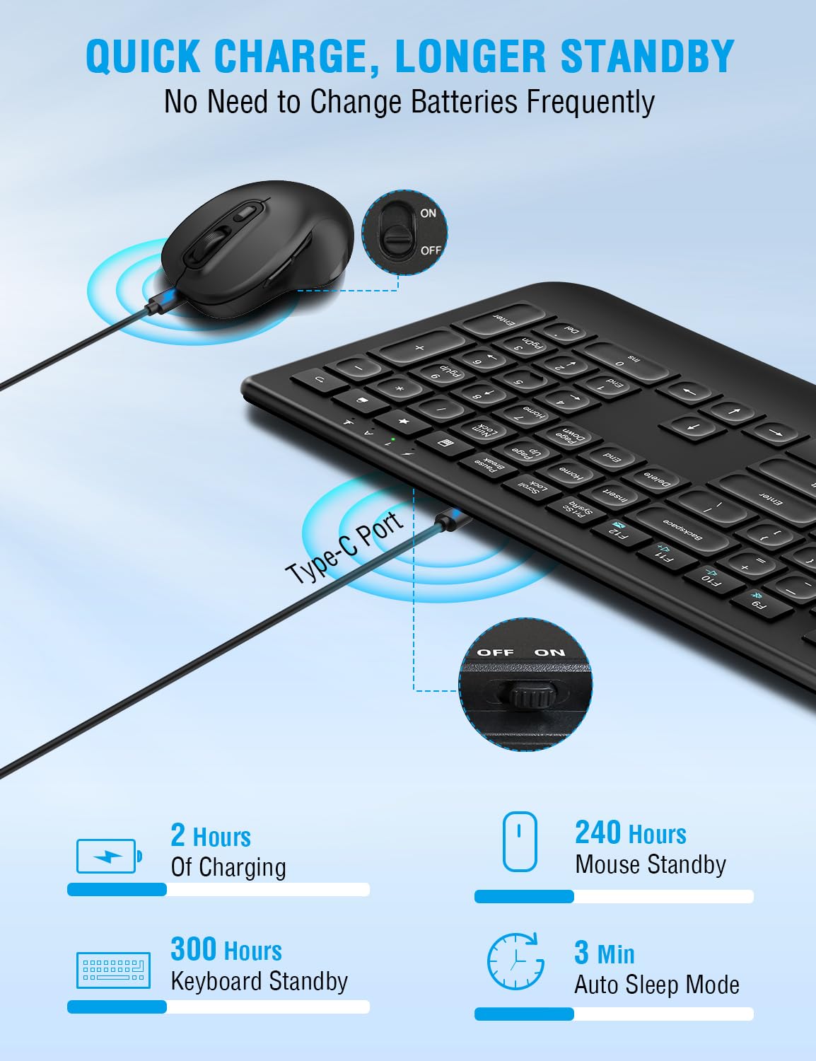 ▶[RECHARGEABLE & SMART ENERGY SAVING] : This wireless keyboard and mouse are equipped with rechargeable 350mAh and 300mAh lithium battery respectively, they provide up to 20 days of usage, say goodbye to the hassle of frequent battery replacements. This keyboard & mouse set can be easily recharged by Type-C charging cable(included). In addition, the wireless keyboard mouse combo is more environmentally friendly with smart energy saving mode and independent ON/OFF design to save power.