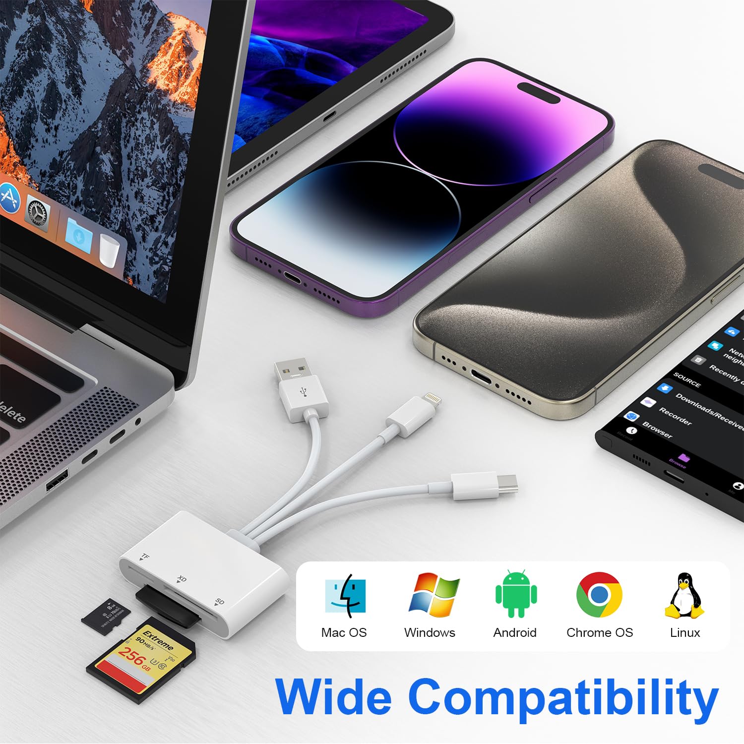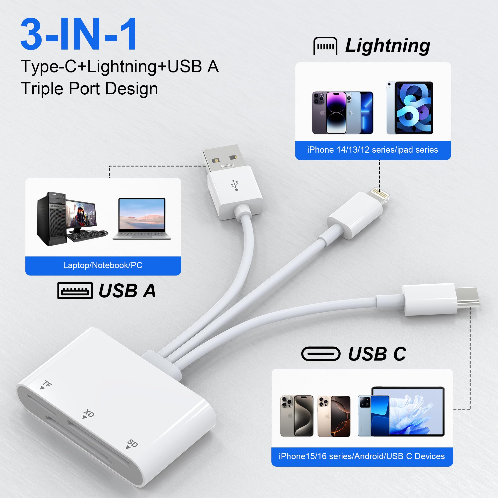 • XD Card Reader, SD Card Reader for iPhone, 3 in 1 SD/TF/XD Picture Reader for Lightning/USB C/USB A Device, Lightning+USB A+USB C xd Picture Card Adapter for iPhone 16/15/14/13/iPad/PC/Android