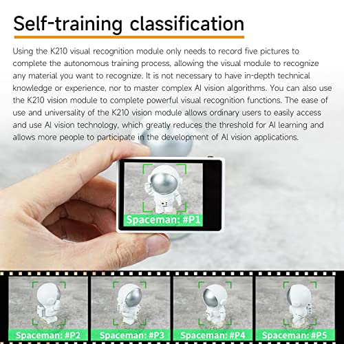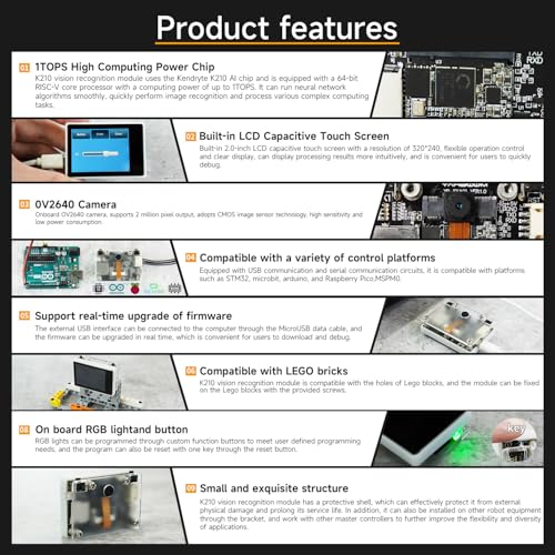 Yahboom K210 visual recognition module is an image processing module based on artificial intelligence technology. It possess a dual-core 64-bit processor, computing power up to 1TOPS. It adopts deep learning algorithm, which can efficiently identify various objects and features in the image. The module integrates a serial interface, which can be connected and interacted with various controllers such as STM32, Raspberry Pico, Arduino, Micro:bit and other hardware devices and platforms. K210 module is small in size and low in power consumption, making it suitable for various embedded systems and intelligent hardware products. Users can easily create many creative AI projects by this module.
